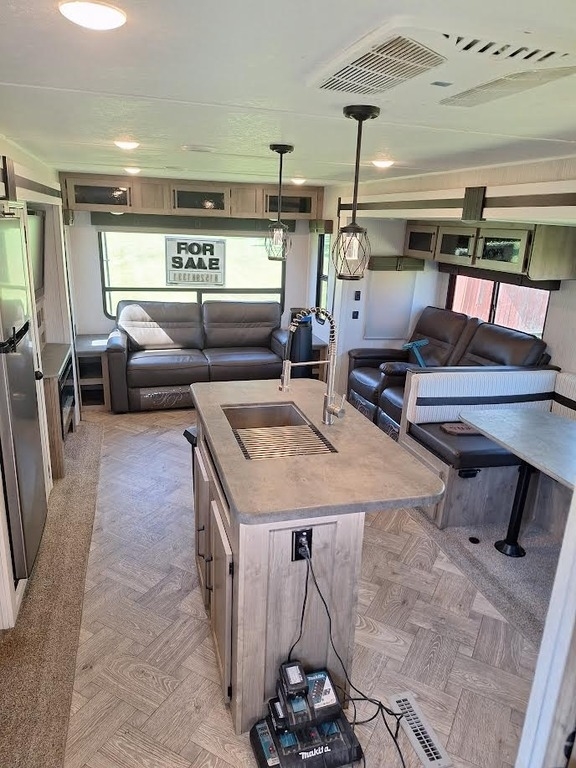 equipped with 2 power retractable slide-outs, a 15-foot power retractable