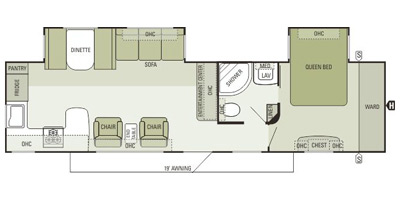 This 37-foot travel trailer comes fully equipped with 2 power retractable slide outs, a 16-ft power retractable patio awning, A/C plus this unit sleeps 4.