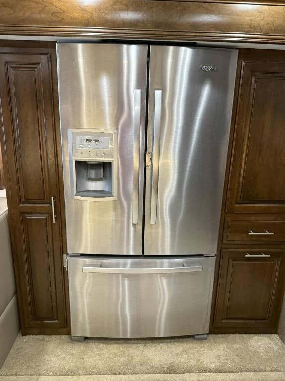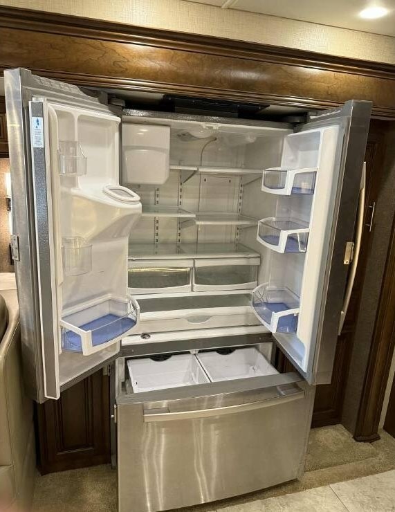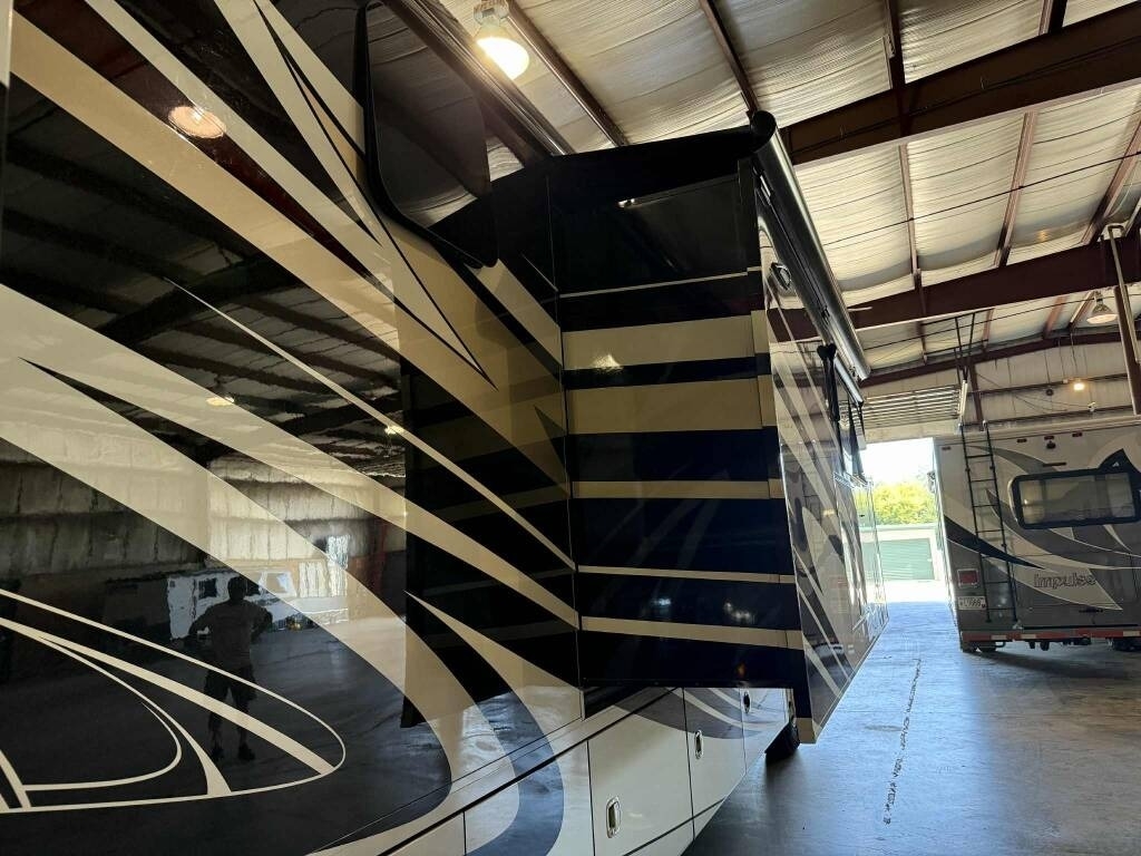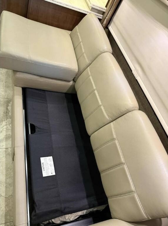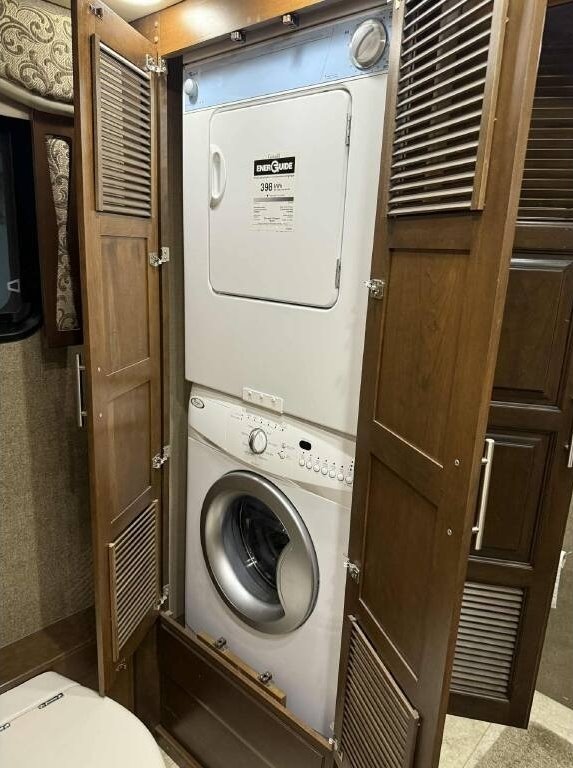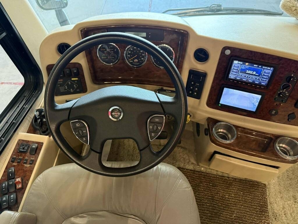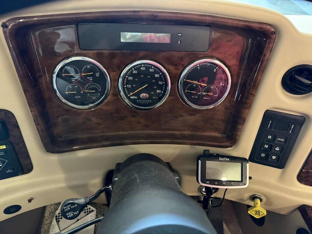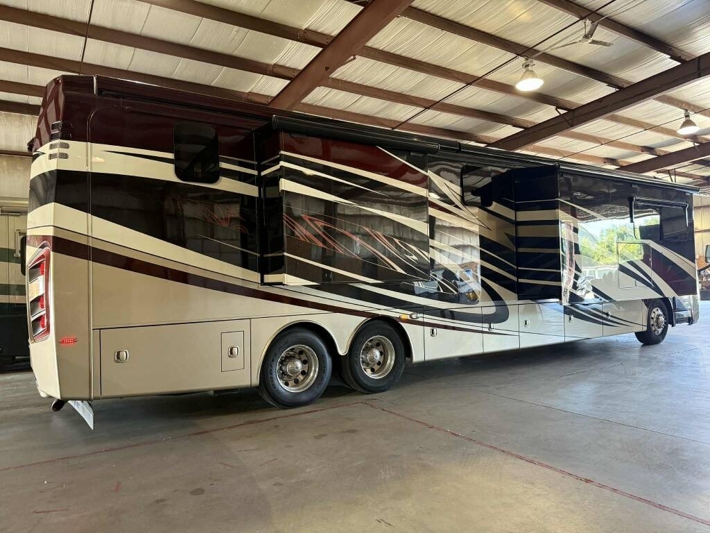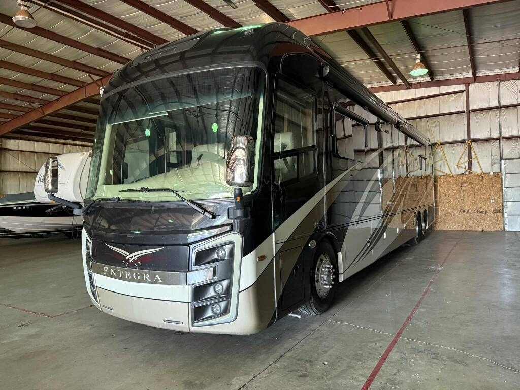 This Entegra is powered by an 8.9L I6 diesel engine and a 6-speed automatic transmission with 61,392 miles. The overall length is 44.92 feet and comes equipped with 4 power-retractable slide-outs, 2 power awnings, 3 A/C units with heat pumps, a generator, 1½ baths, bunk beds, an outdoor entertainment system, and room to sleep up to 6. This unit has been well-maintained.
