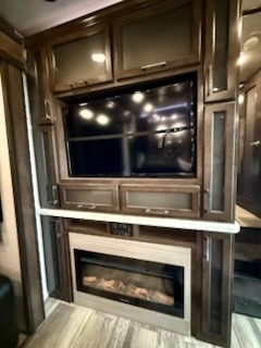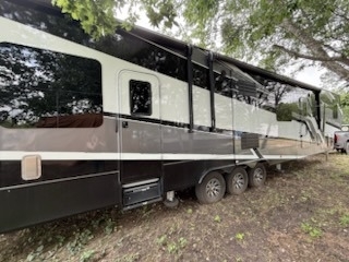 This Voltage has an overall length of 46.67 feet and comes equipped with 3 power retractable slide-outs, 3 power retractable awnings, 3 A/C units, a generator, a 13-foot garage, 1½ baths, a fireplace, and plenty of room to sleep 7. This unit has been well-maintained.