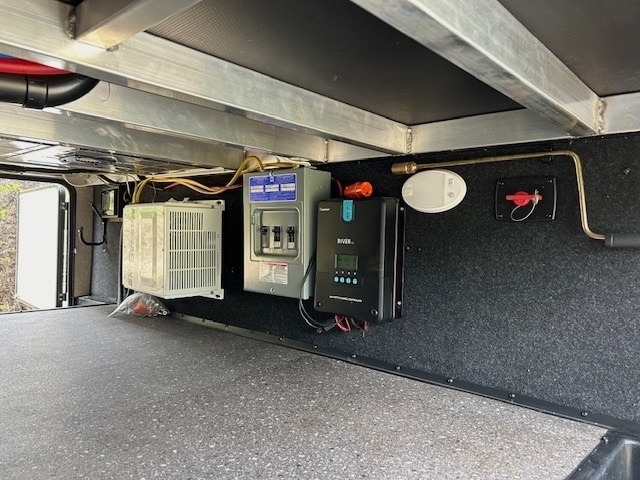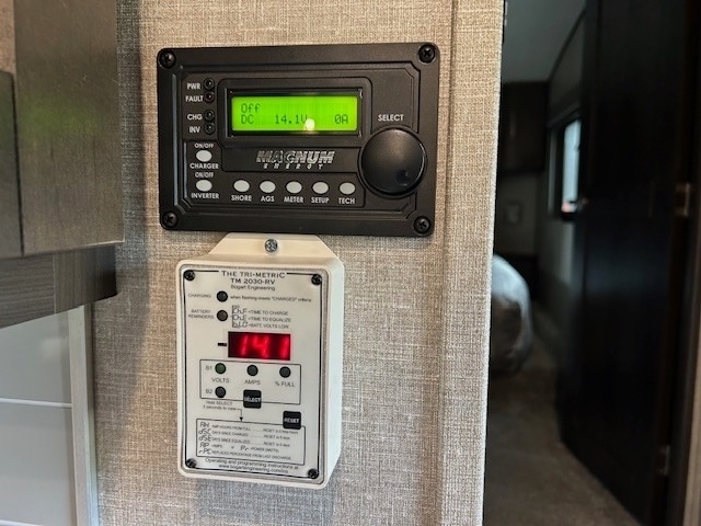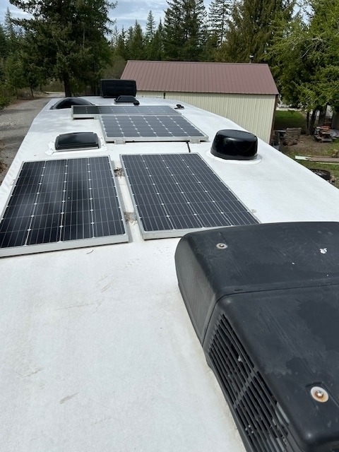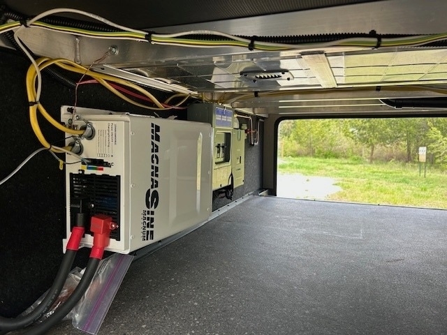 Off-the-grid solar system including: Magnum MS 2812 series inverter/charger, 4 solar panels totaling +- 650 Watts, remote in-house Magnum controller.