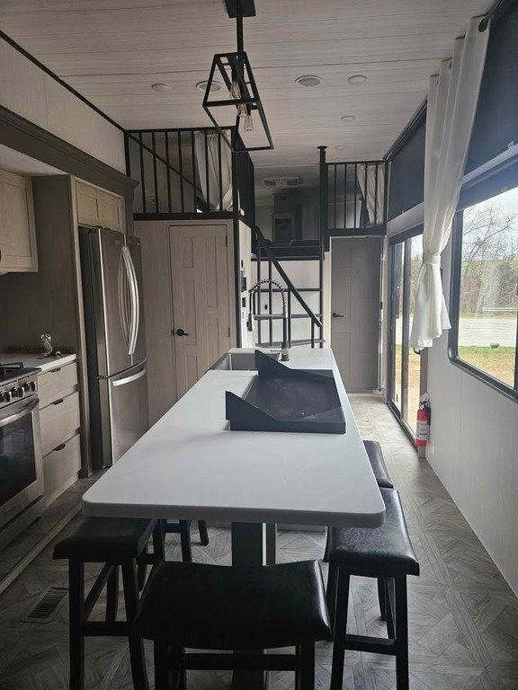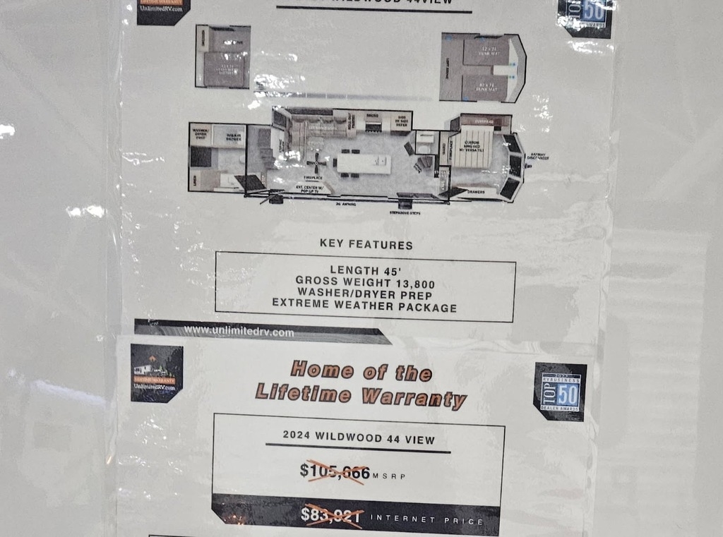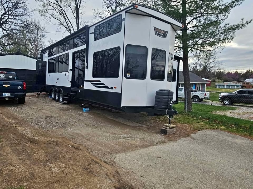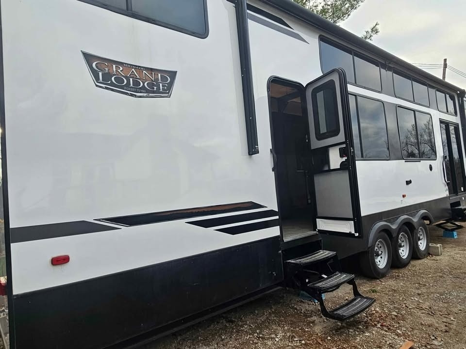 “This 2024 Forest River Wildwood Grand Lodge 44VIEW Destination Trailer is just one year old and was lived in for only 8 months, making it a fantastic opportunity to own a nearly new unit that's already been warranty-checked and inspected for peace of mind. At 45 feet long, this spacious destination trailer feels more like a tiny home, comfortably sleeping up to 8 and offering 1½ bathrooms, a full-size kitchen, and tons of storage throughout. It’s loaded with high-end features, including a pop-up TV, two electric fireplaces, a central vacuum system, and stylish accent lighting throughout—ceiling lights, floor lighting in the kitchen, and LEDs around the top of the awning for a cozy outdoor vibe. It also comes with outdoor speakers, making it perfect for entertaining. Whether setting it up as a full-time home or a luxurious getaway spot, this Grand Lodge 44VIEW is ready to deliver comfort and style.”