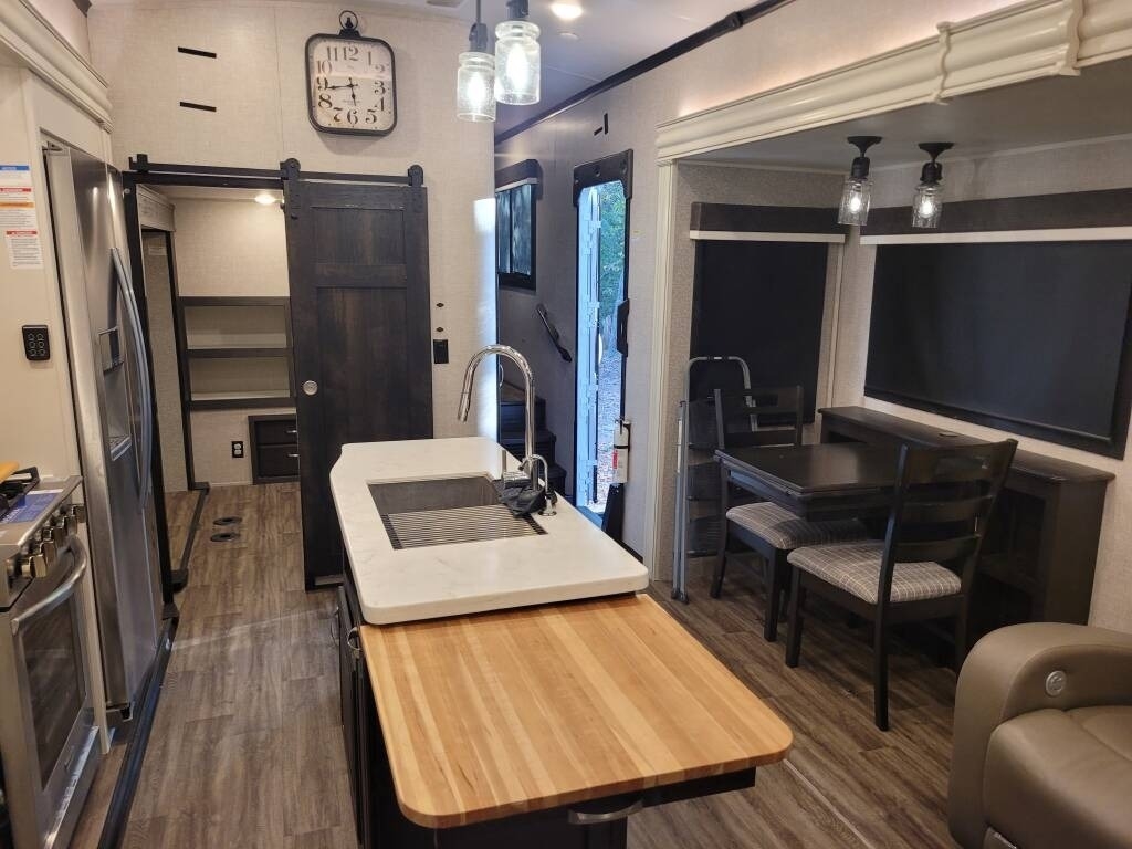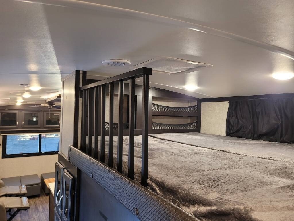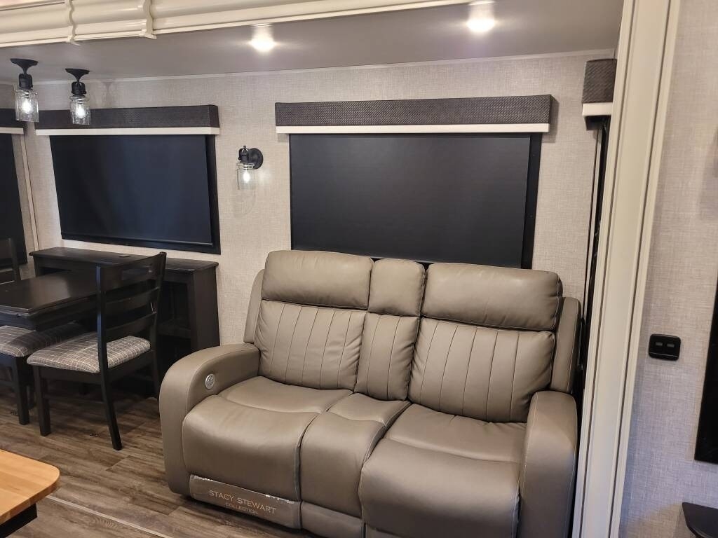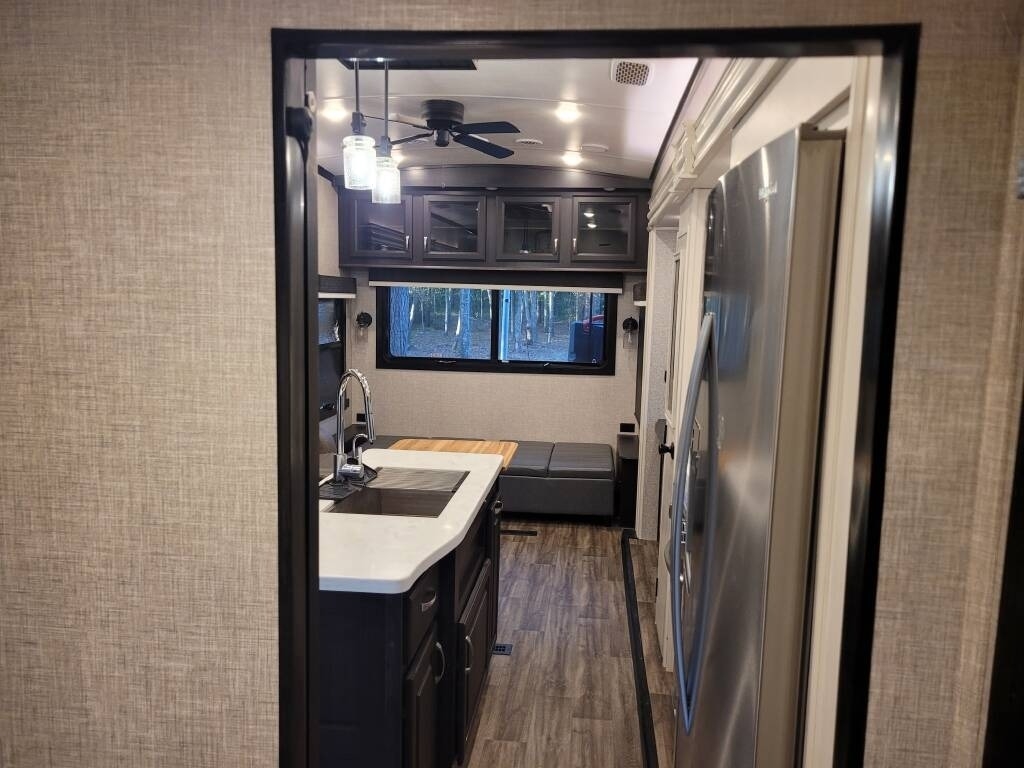 “This stunning 2022 Jayco North Point 377RLBH Fifth Wheel is in like-new condition and ready for its next adventure, as it has barely been used and is looking for new owners. With four spacious slides, this unit offers a generous living area for ultimate comfort. The well-equipped kitchen features a residential refrigerator/freezer, a large pantry, stove, oven, microwave, and a kitchen island, making it perfect for preparing meals on the road. The main living area boasts an entertainment center with a pop-up TV and fireplace, theater seating, and a sofa. Additionally, there is a versatile bonus room with a desk, TV, and a flip-up bunk, ideal for work or relaxation. The large bathroom provides ample space, while the main bedroom offers plenty of storage and a king bed (mattress not included) for a restful night's sleep. The fifth wheel hitch is included, so you don’t have to worry about purchasing one. Plus, this unit comes with a transferrable extended warranty, ensuring peace of mind for the new owner. This North Point 377RLBH is ready to hit the road and provide years of enjoyment.”