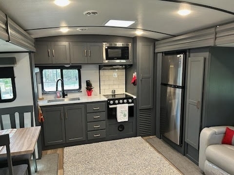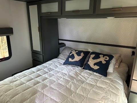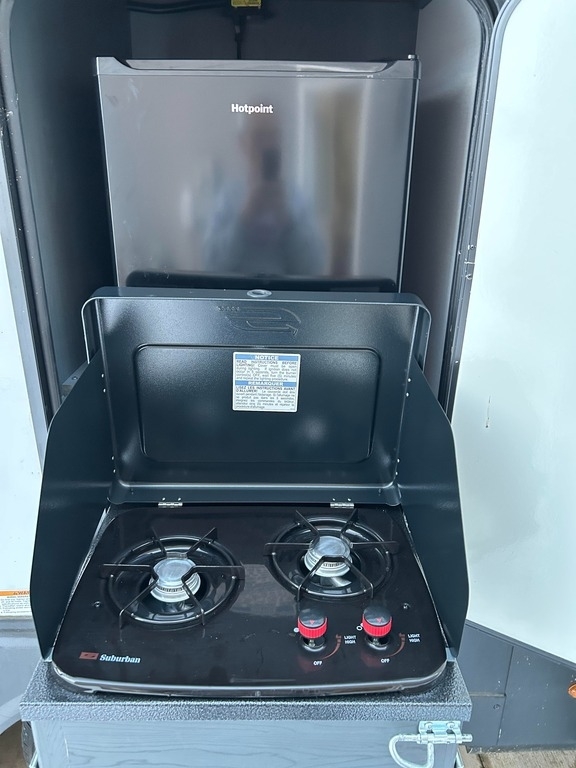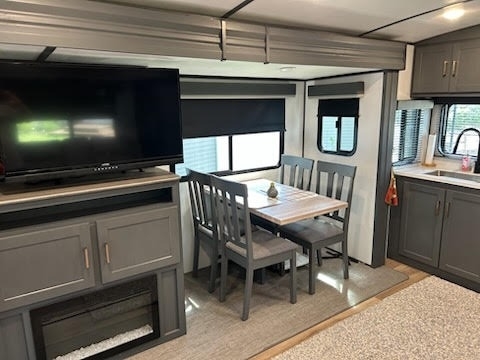 awning, 1 A/C unit, a fireplace, an outdoor kitchen, and room to sleep up to 4.