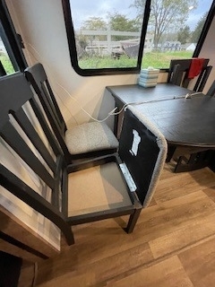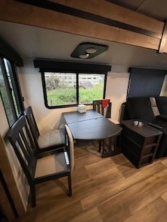 a 3-burner range with oven, microwave, full-size refrigerator, and booth dinette.