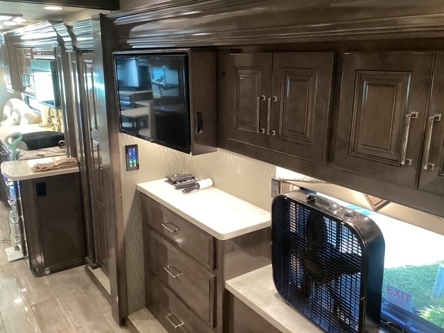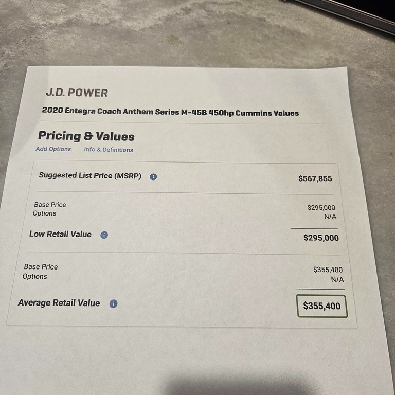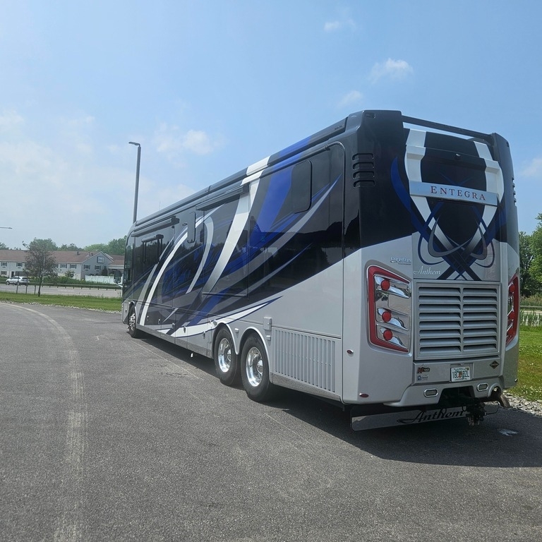 This Entegra is powered by a 8.9L Cummins engine and a 6-speed automatic transmission with 51,000 miles. The overall length is 44’ 11” and it comes equipped with 4 power retractable slide-outs, 2 power retractable awnings, 3 A/C units, 1.5 bathrooms, a generator, and plenty of room to sleep 3 comfortably. This unit has been well-maintained, always stored indoors, and receives regular maintenance.