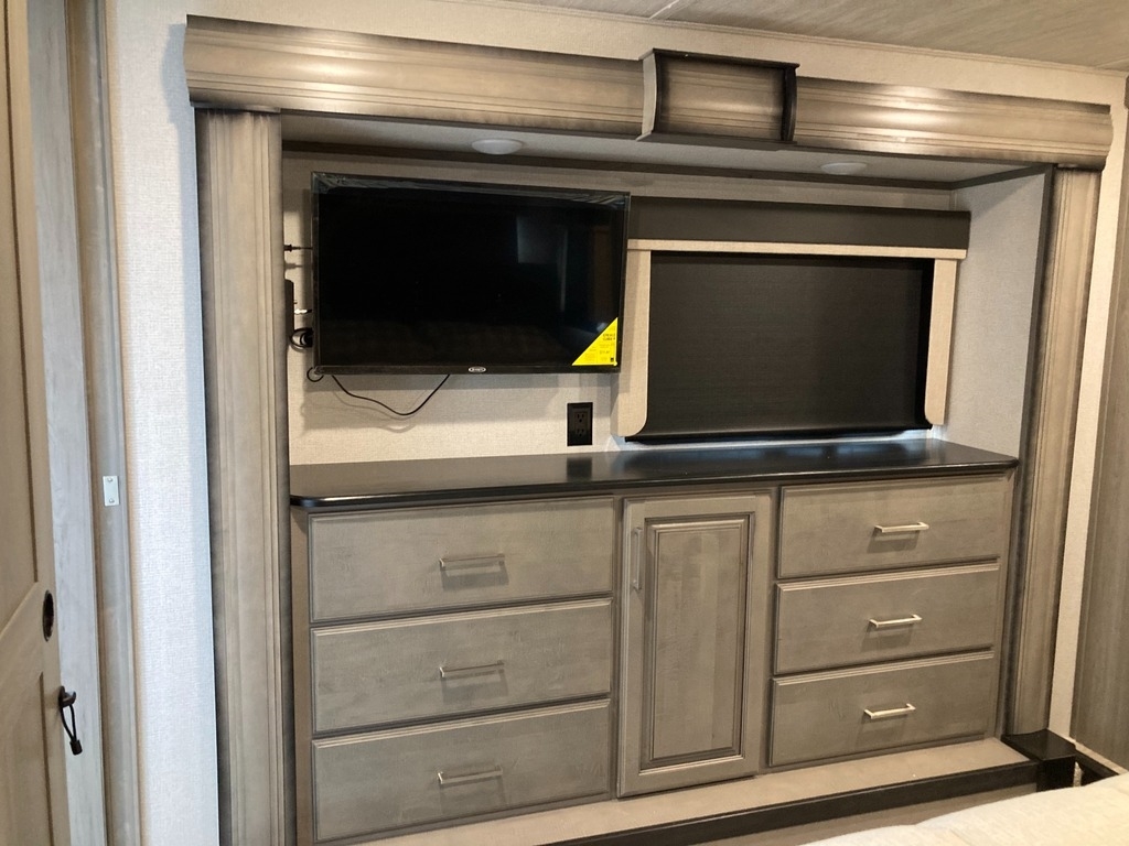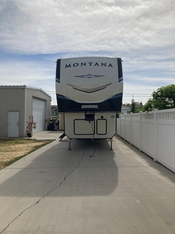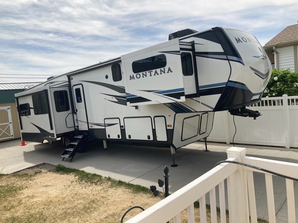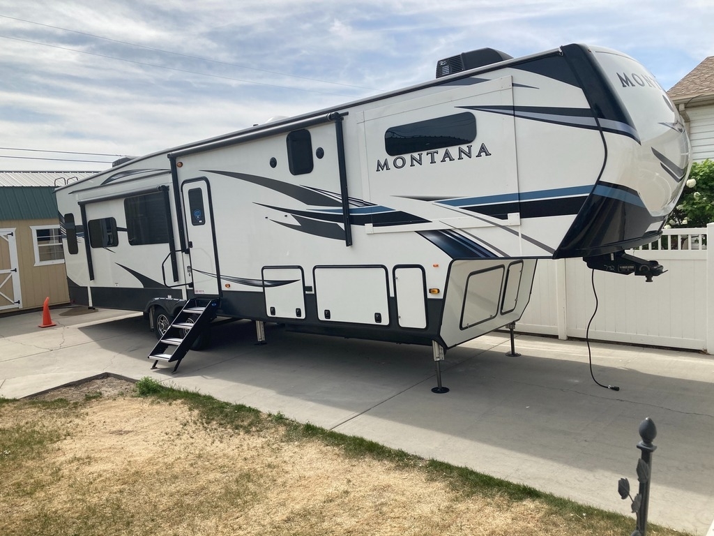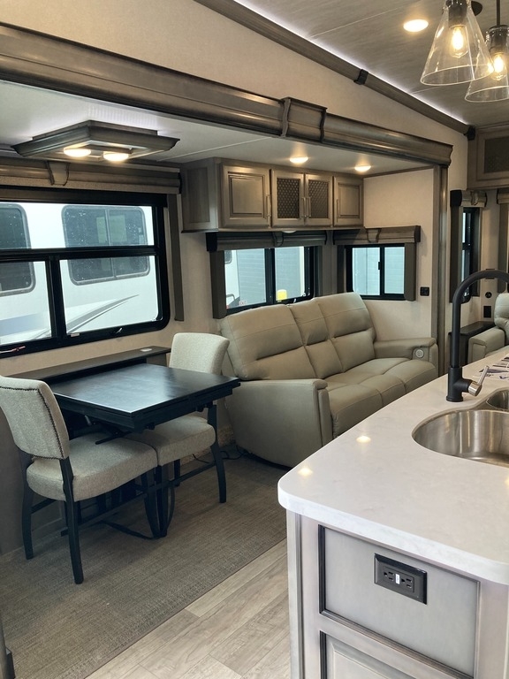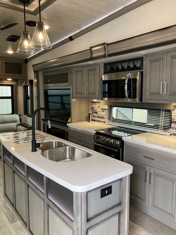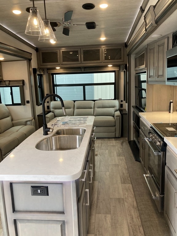 This 2021 Keystone has an overall length of 41 feet and comes equipped with an Onan Generator, 4 Slide Outs, 2 Awnings, 2 A/C units and plenty of room to sleep 4.