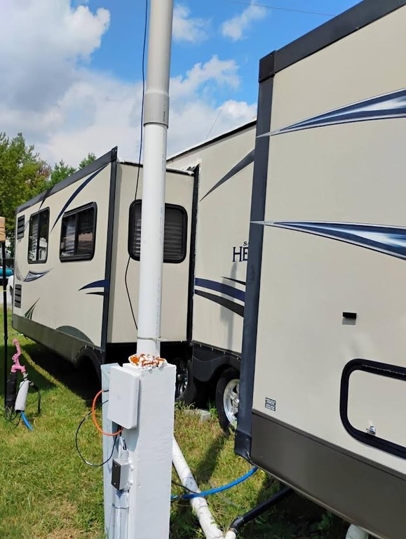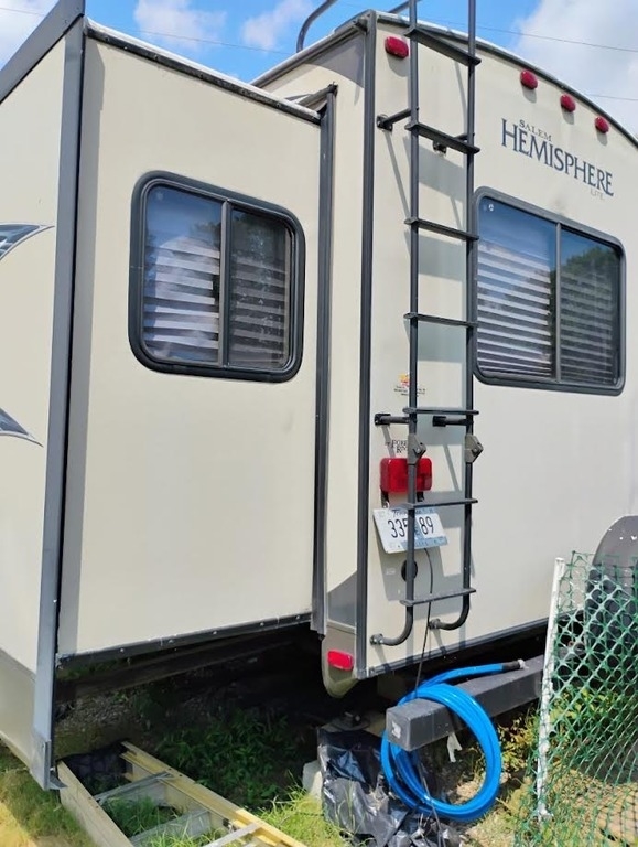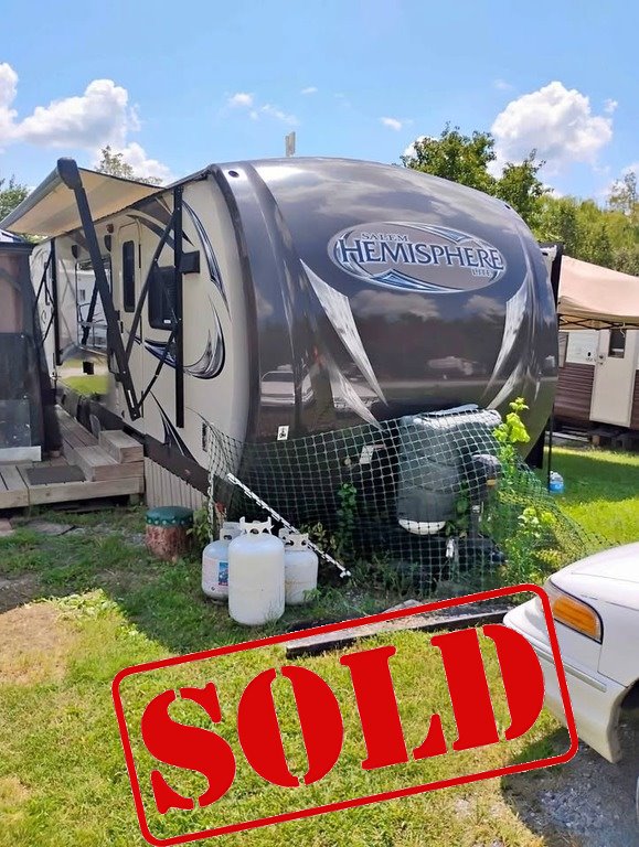 This Salem Hemisphere Lite is lightweight, towable, and ready for adventures – with the bonus of a deck, shelter, shed, and full utility hookups already in place. Perfect for seasonal camping or setting up a long-term getaway spot.