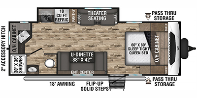 This Stratus has an overall length of 27 feet and comes equipped with 1 power retractable slide-out, an 18-foot power retractable awning, A/C, solar, and room to sleep up to 4. This unit has been well-maintained.