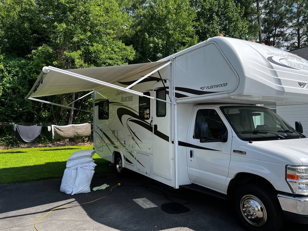 This is a 2014 Jamboree Searcher 25' Class C RV with an E450 Ford Chassis. This Jamboree has a V10 Gas Engine with 26,000 Miles. This RV Also Contains an Onan Cummings 4000 Generator and Includes One Slide-Out, has a Newer Awning, and Sleeps 6 People Comfortably.