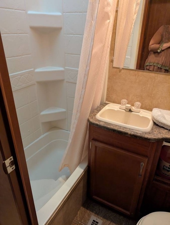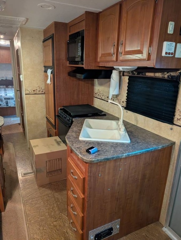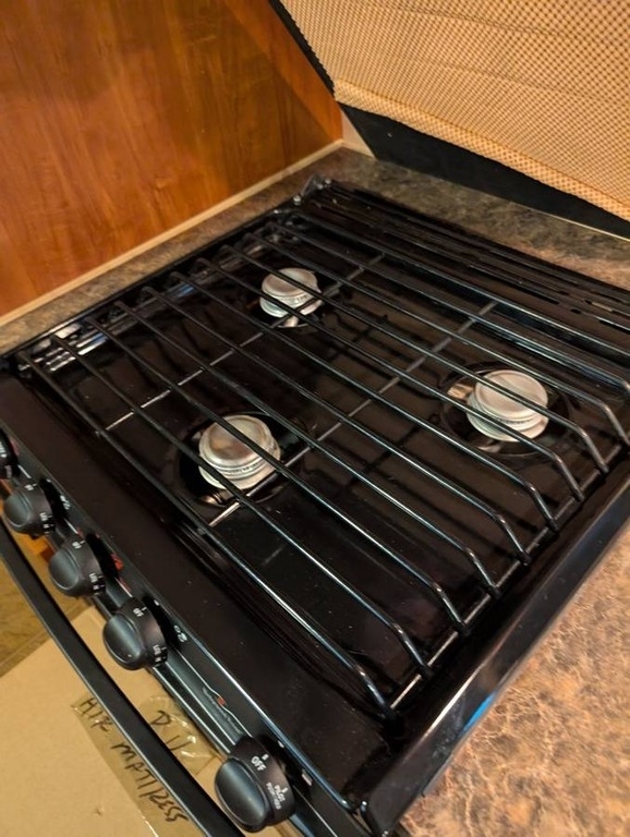 Kitchen: Microwave, 3-Burner Gas Stove, Oven, Mid-Size Electric/Propane Refrigerator, Double Sink, Cutting Board Covers