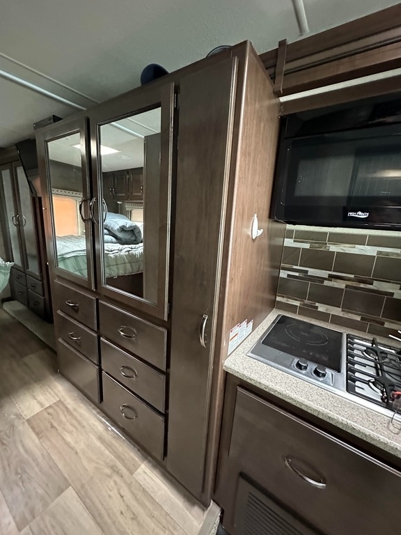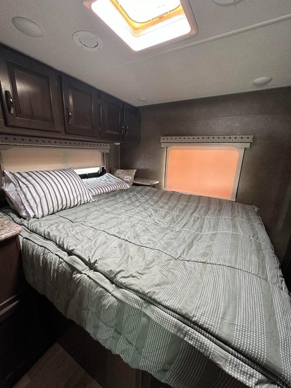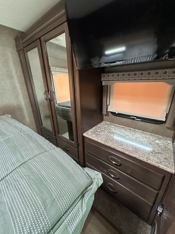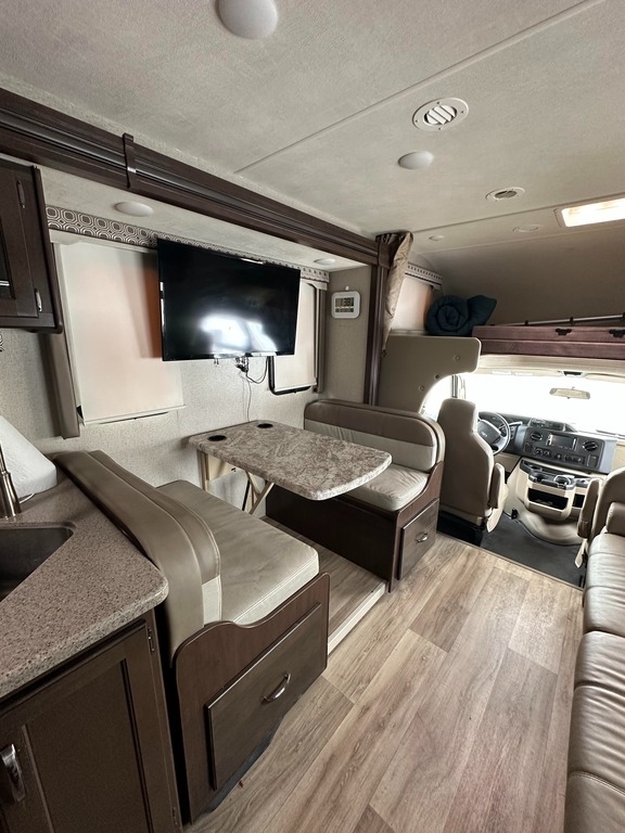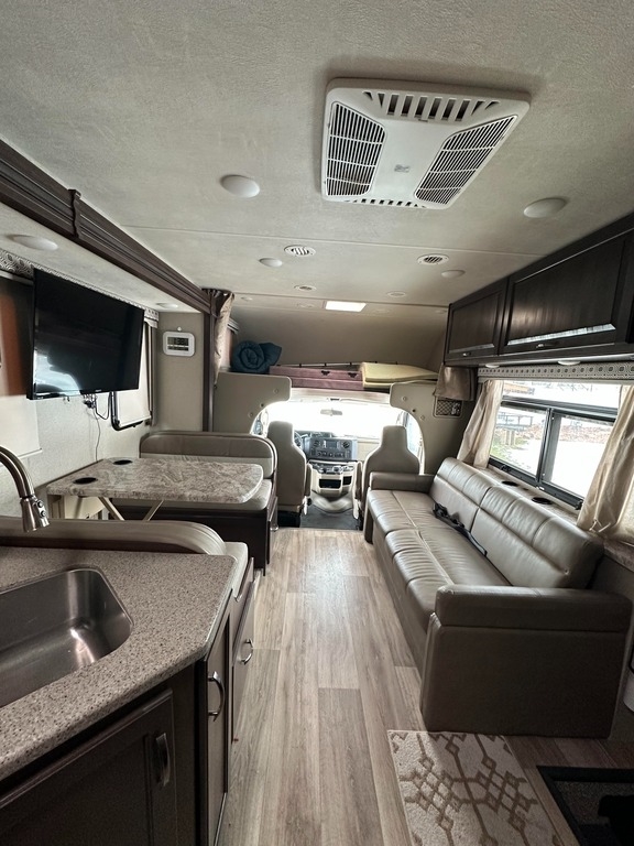 This Thor is powered by a 6.8L V10 engine and a 6-speed automatic transmission with 1,180 miles. The overall length is 32.17 feet and it comes equipped with 1 power retractable slide-out, 1 power retractable awning, 1 A/C unit, a generator, and plenty of room to sleep 8. This unit has been well-maintained.