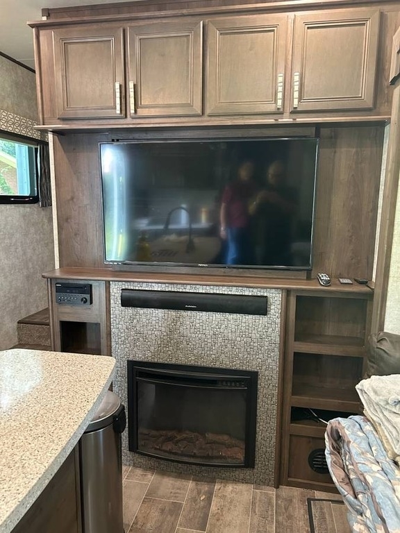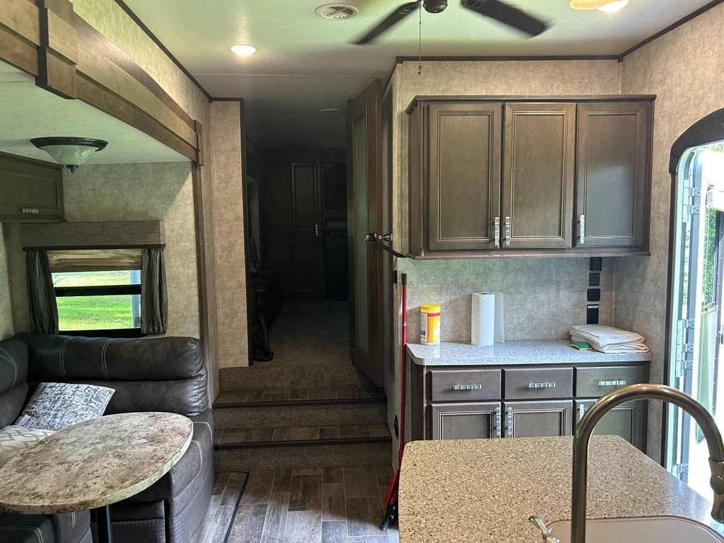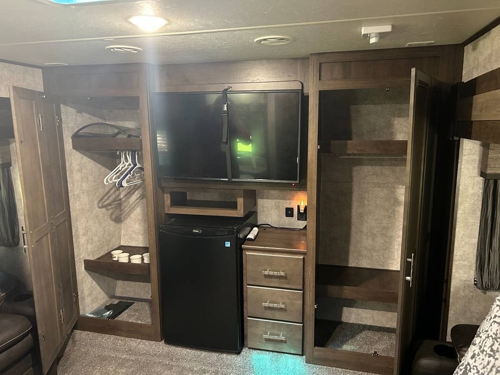 comes equipped with 5 power retractable slide-outs, 1 power retractable awning,