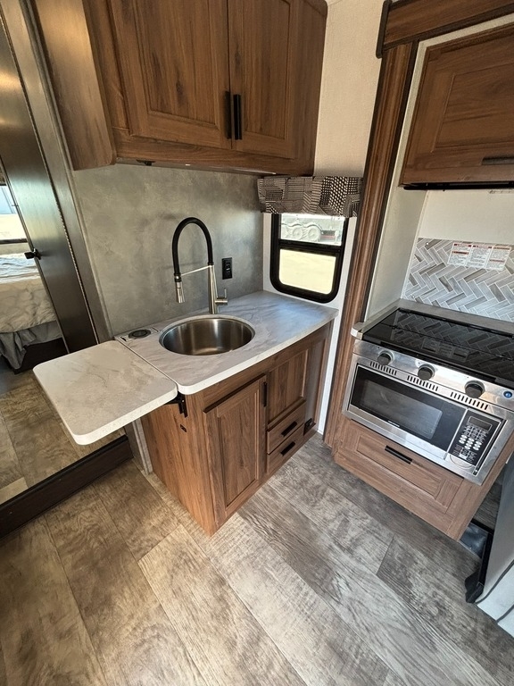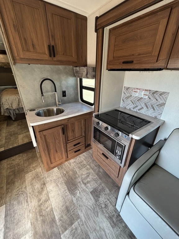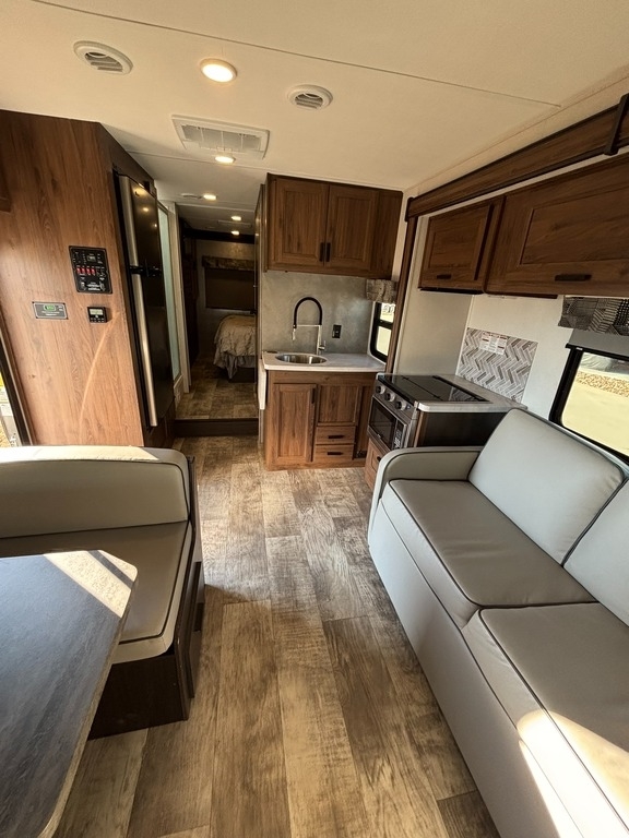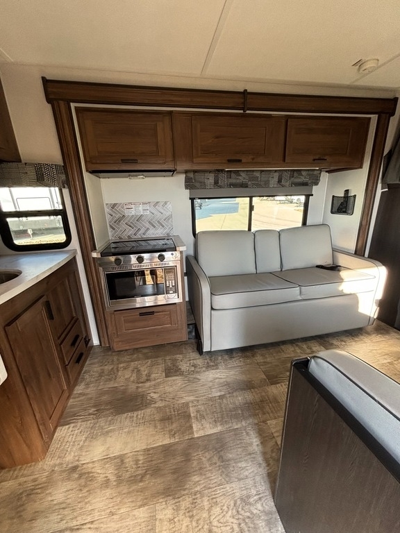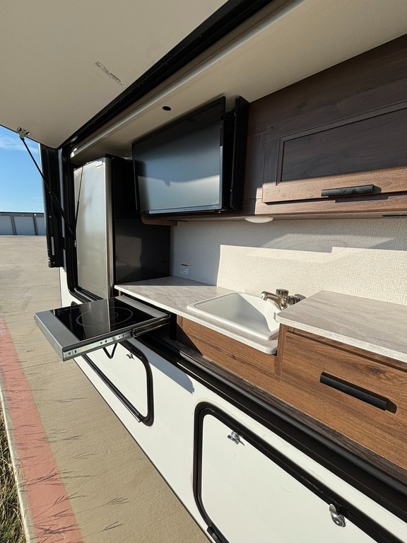Fully Equipped Center Kitchen With 3-Burner Stove, Microwave, And Full-Size 12V Refrigerator