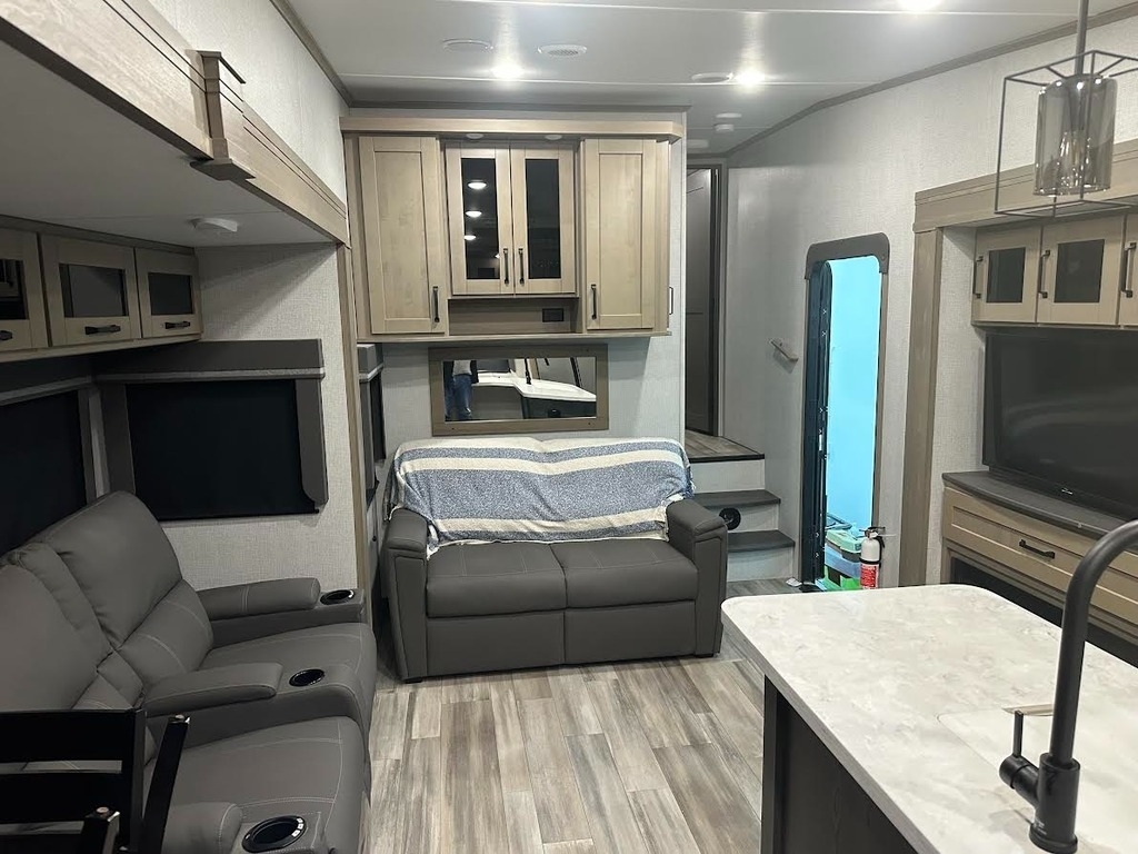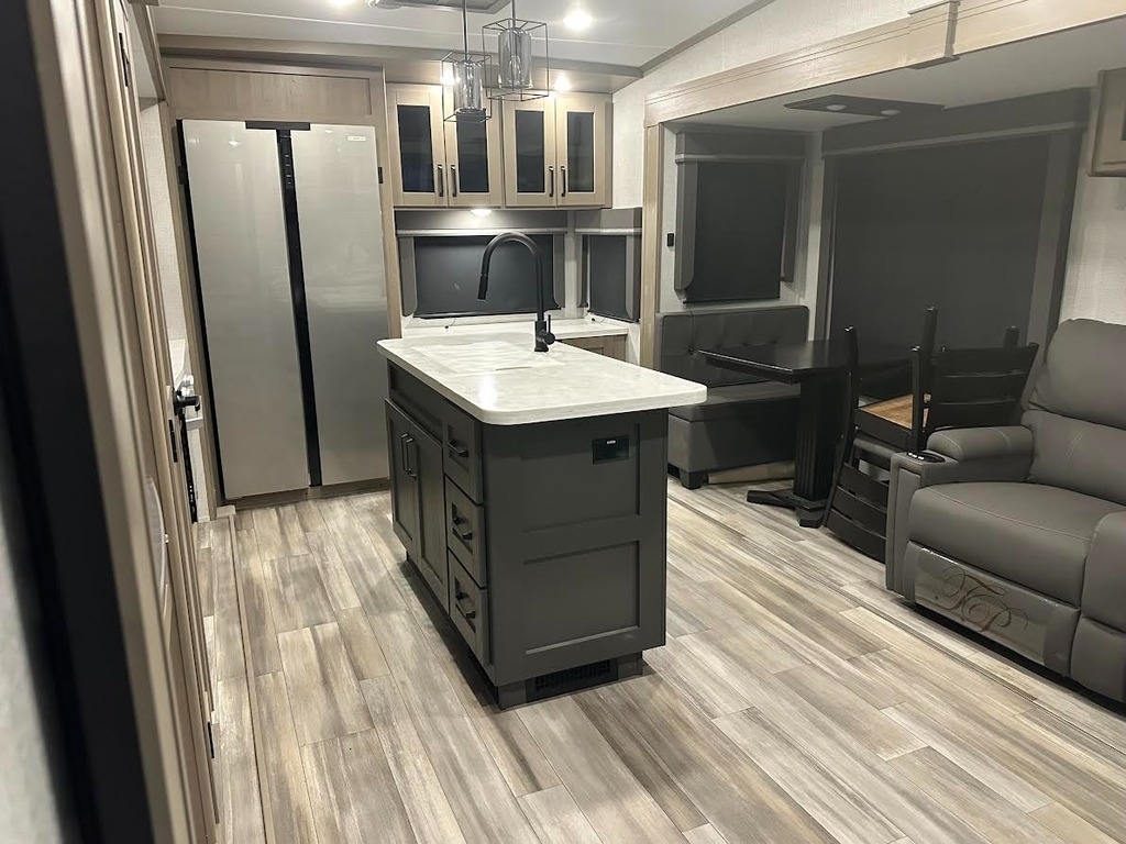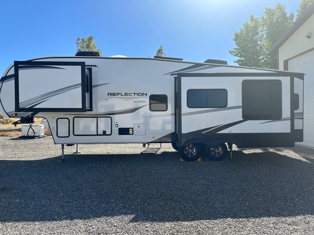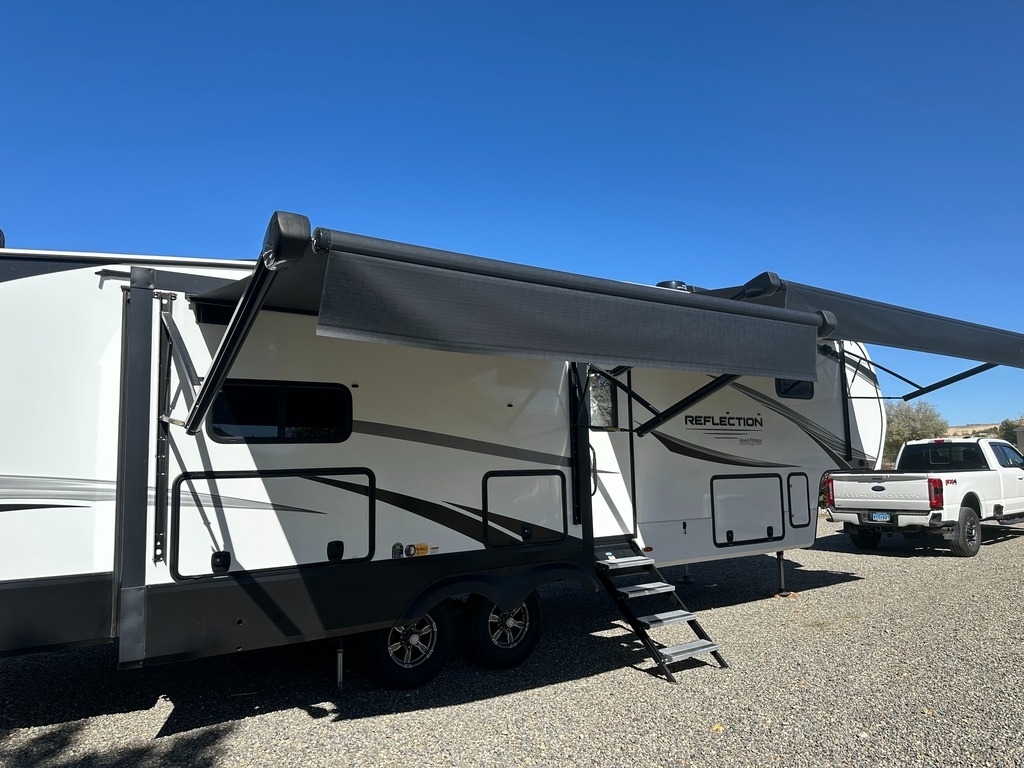 “For sale is my 2023 Grand Design Reflection 320MKS Fifth Wheel, in excellent condition inside and out. This coach has been meticulously cared for and has always been stored under cover when not in use. The 320MKS combines luxury, comfort, and functionality, featuring a spacious rear kitchen with solid-surface countertops, residential-style appliances, and plenty of storage. The middle living area includes theater seating, a tri-fold sofa, a large TV, and a cozy fireplace, making it perfect for relaxing or entertaining. Up front, you’ll find a private bedroom with a queen bed and wardrobe slide, along with a large bathroom featuring a residential-style shower and vanity. Additional highlights include an outdoor kitchen and TV, power awning, auto-leveling system, and a heated, enclosed underbelly for four-season camping. It’s also equipped with washer/dryer prep, dual A/C units, and upgraded insulation for year-round comfort. This Reflection has never been smoked in, and everything works perfectly. It’s road-ready, feels like new, and is a great opportunity to save thousands compared to buying from a dealer.”