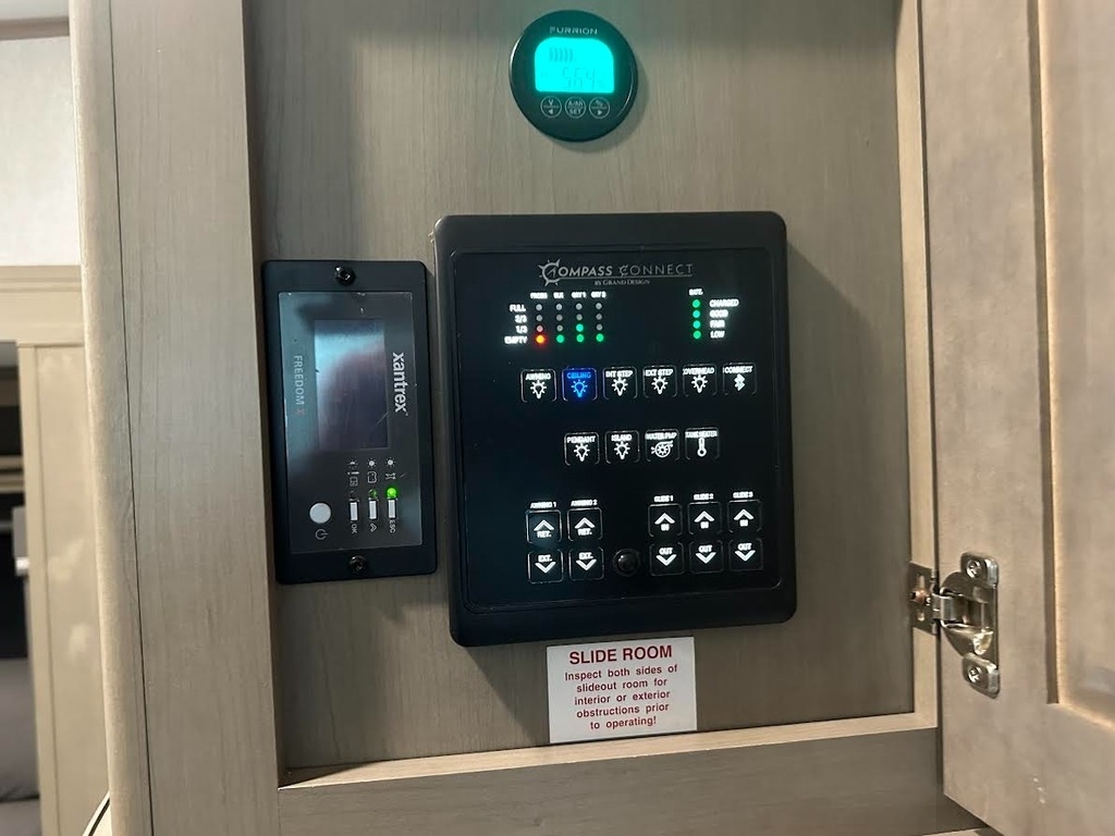 This Grand Design has an overall length of 34.67 feet and comes equipped with 3 power-retractable slide-outs, 2 power awnings, 2 A/C units, a fireplace, an outdoor kitchen & entertainment system, and room to sleep up to 4. This unit has been well-maintained.