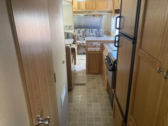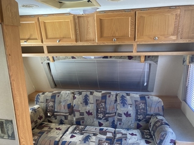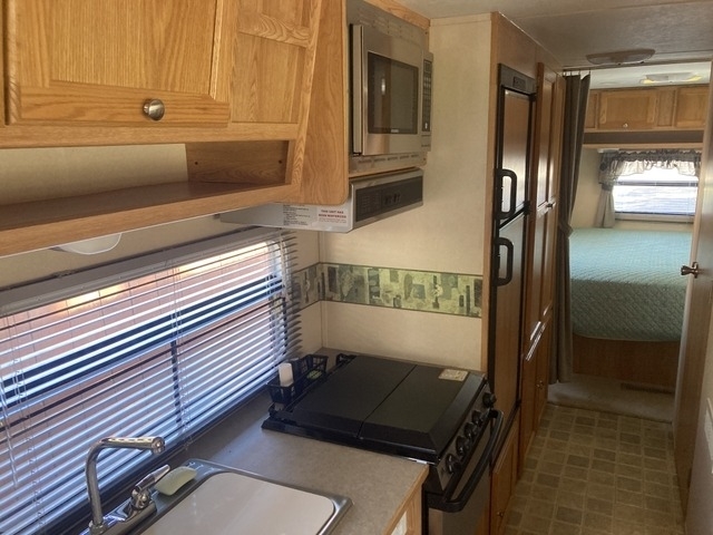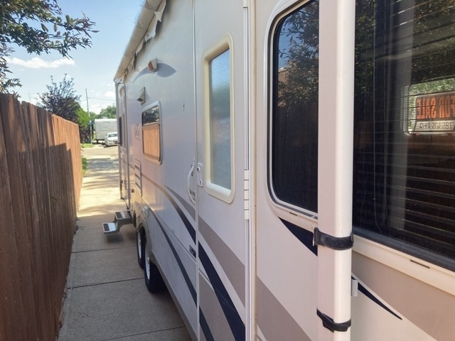 trailer is 28 feet long. It features 1 slide, 1 A/C unit, 1 awning, and plenty