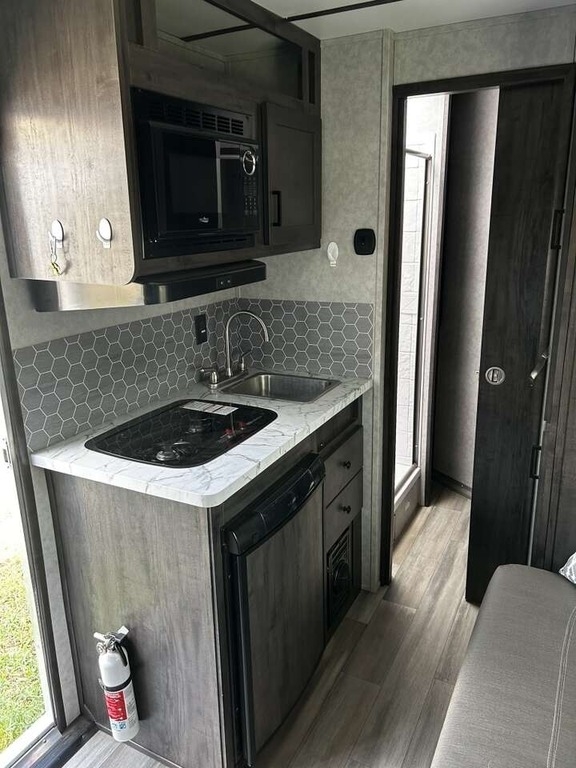 sleeping space. The kitchenette is equipped with a microwave, a 2-burner stove,