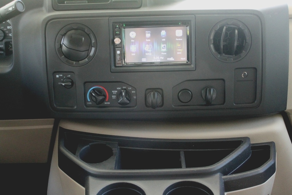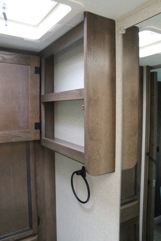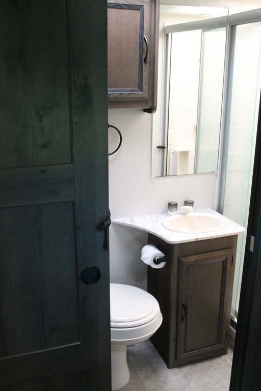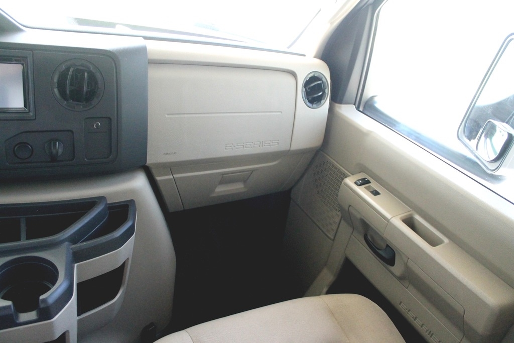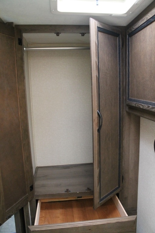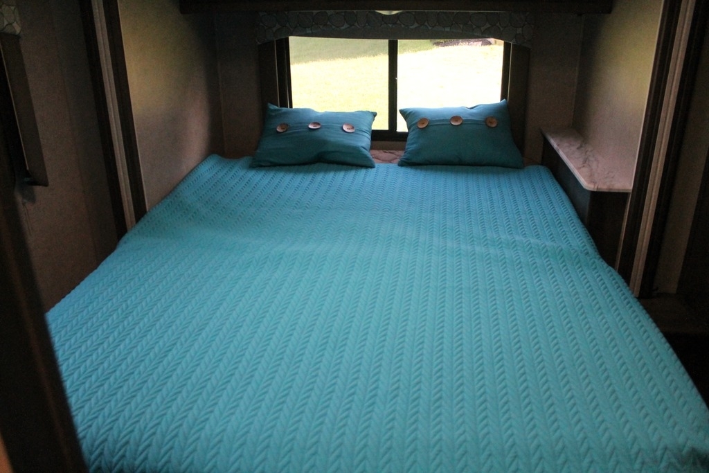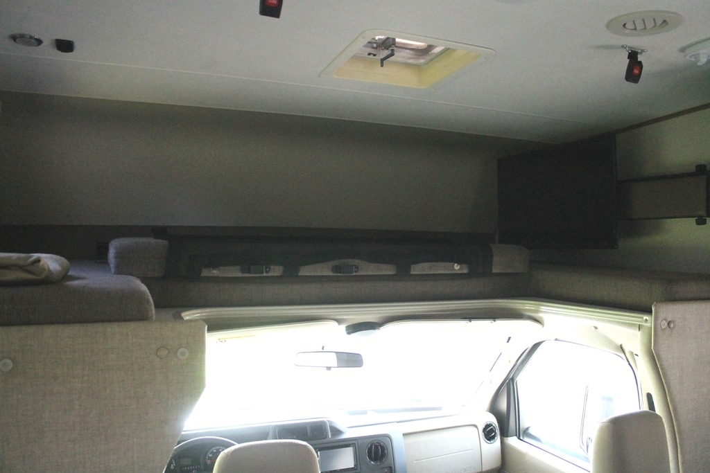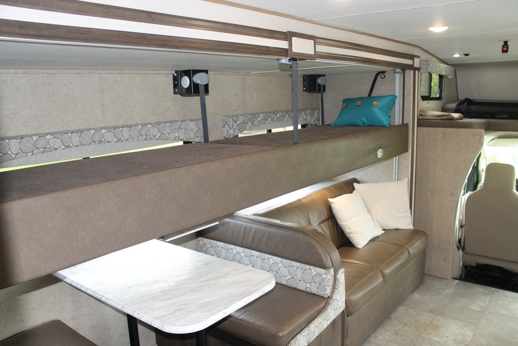 With the two slides (bedroom and dinette/living), this is the most comfortably spacious Class C we found. Both cockpit seats swivel for convenient use with the living room sofa and swivel HD television with directional HD antennae (operable from inside) and CD player, both with remote controllers. The bathroom has a storage closet with a drawer for hanging clothes, a wall cabinet for toiletries and a base cabinet with sink and adjacent toilet. The easy clean shower has sliding plexi-glass door and handheld sprayer with “camper” valve adjustment.