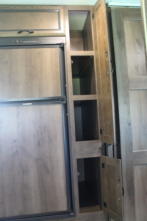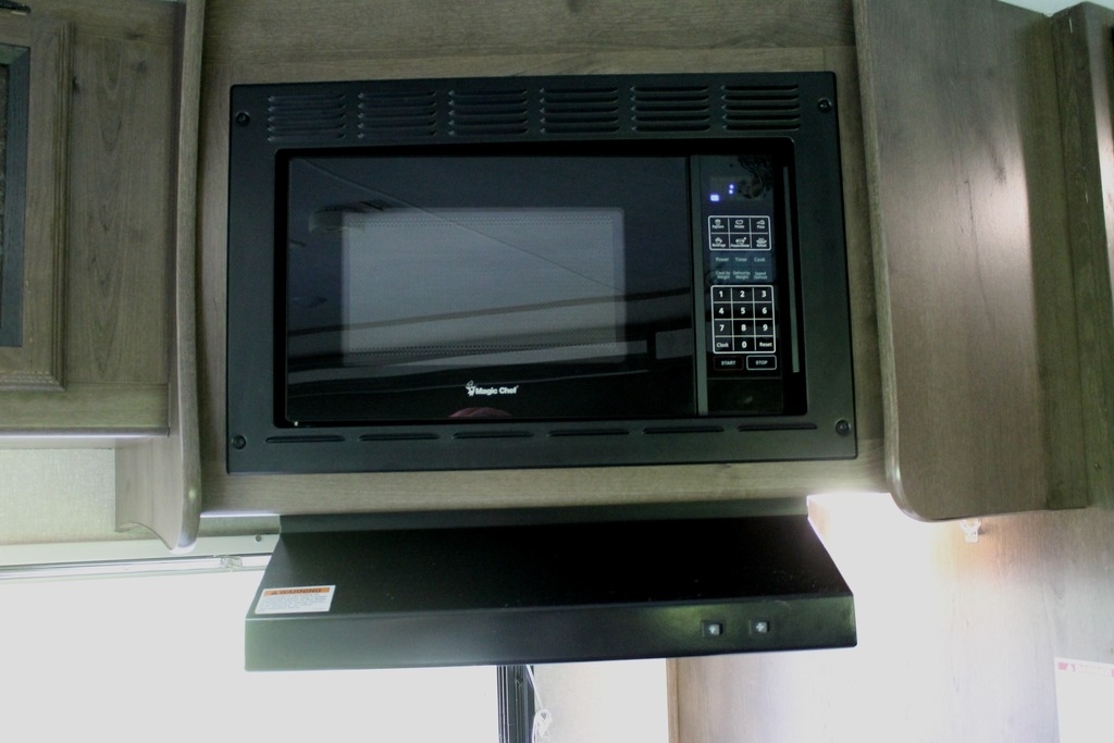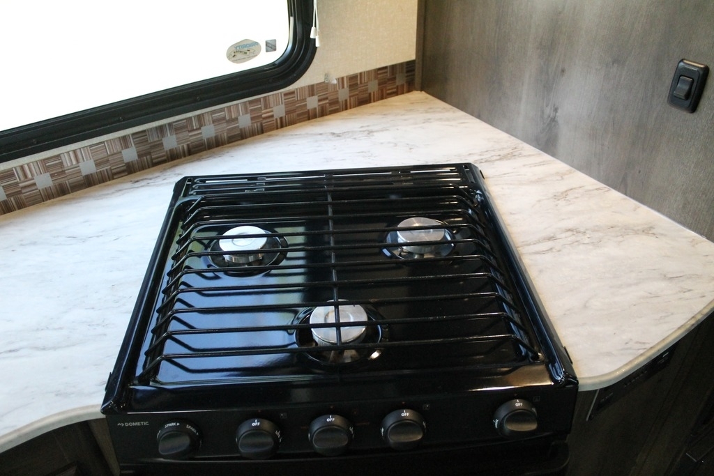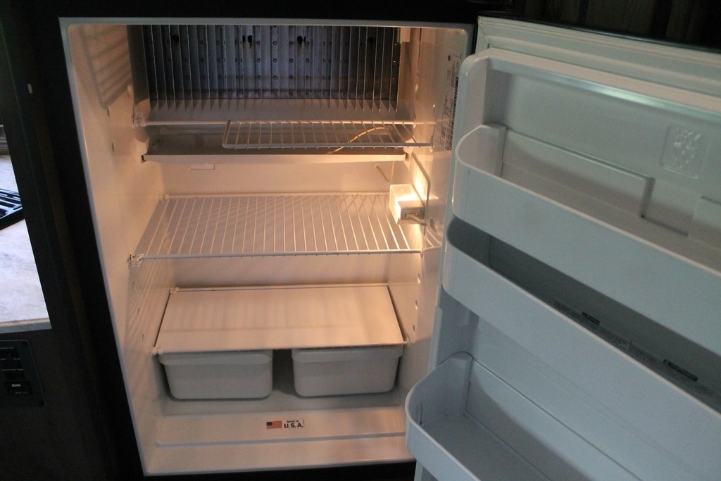 The kitchen has a three-burner gas stove with gas oven, a microwave (.9 CF), as well as an 8 CF refrigerator/freezer, operable on 110 V AC or LP Gas with Auto-select for use when on the road without having to run the generator. The dinette has easy access storage bins under the seats and can be converted to a bed. The pull-out couch also has a storage compartment underneath. Dinette seats have built in seat belts (4) as does the futon/sofa (3).