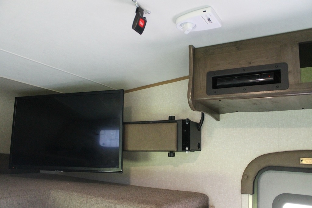 Additionally, there is an outdoor compartment located under the awning which features a mounted HD television along with stereo/radio, both with remote controllers for operation, pleasant for outdoor use. Beneath the awning is full length LED “patio lighting”. There are numerous substantial outdoor storage compartments under the RV to carry other camping gear and travel supplies.
