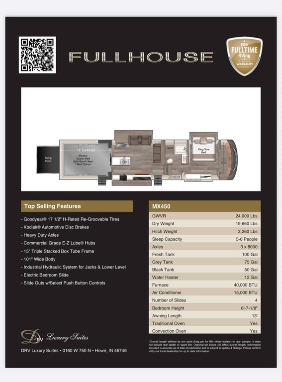 This DRV Has An Overall Length Of 44.42 Feet And Comes Equipped With 4 Power Retractable Slide-Outs, 3 Power Retractable Awnings, 3 Air Conditioners, 7KW Gas Onan Generator, 13' Garage, And Plenty Of Room To Sleep 8. This Unit Has Been Well-Maintained.