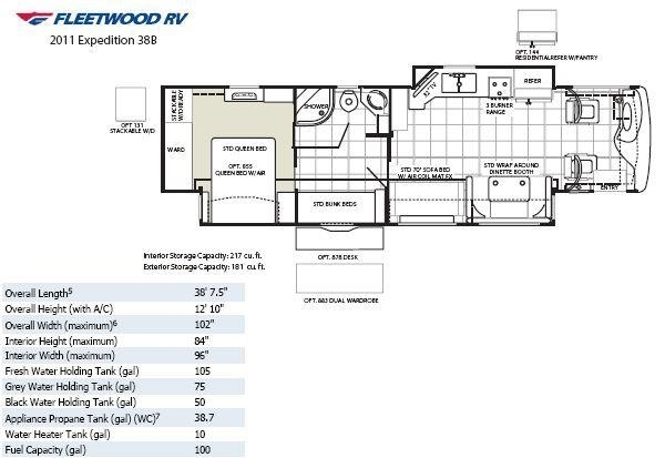 This 2011 Fleetwood Expedition is powered by a Cummins I6 Diesel Pusher Engine combined with an automatic transmission. The overall length is 38 feet and comes with a Queen Size Bed, has 2 Slide Outs and sleeps 8. This is a non-pet/non-smoking RV and there has not been any accidents or water damage.