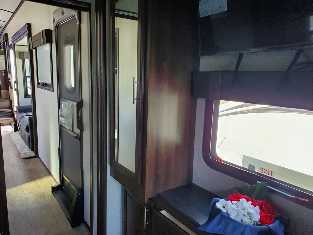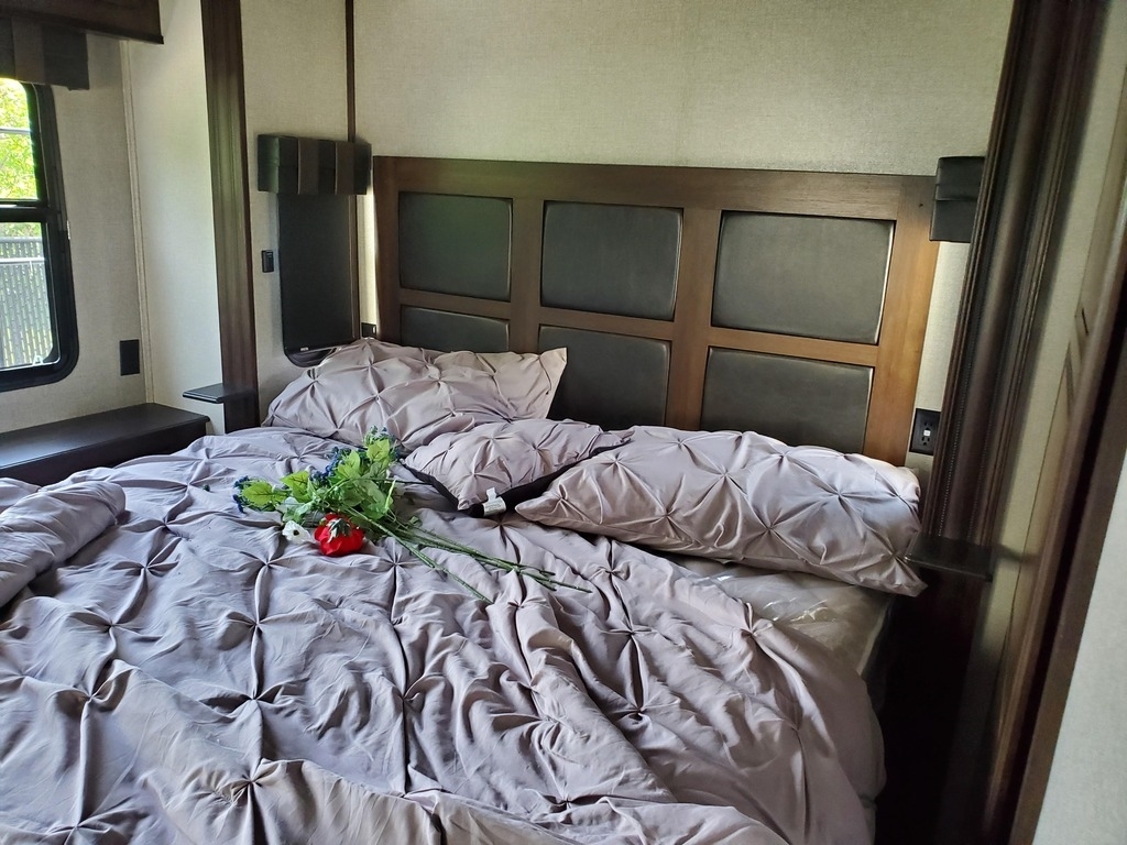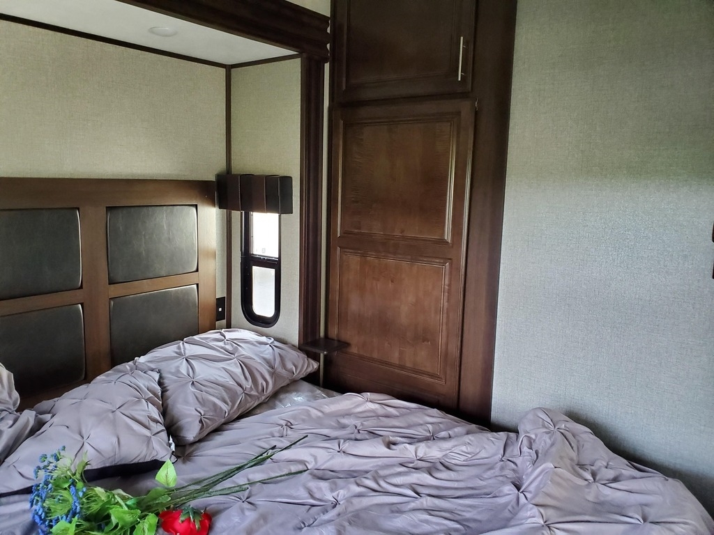 with 5 power retractable slide-outs, 1 power retractable awning, A/C, a fireplace,