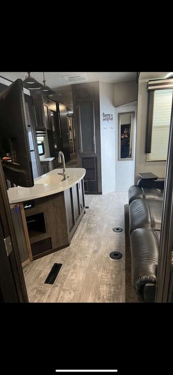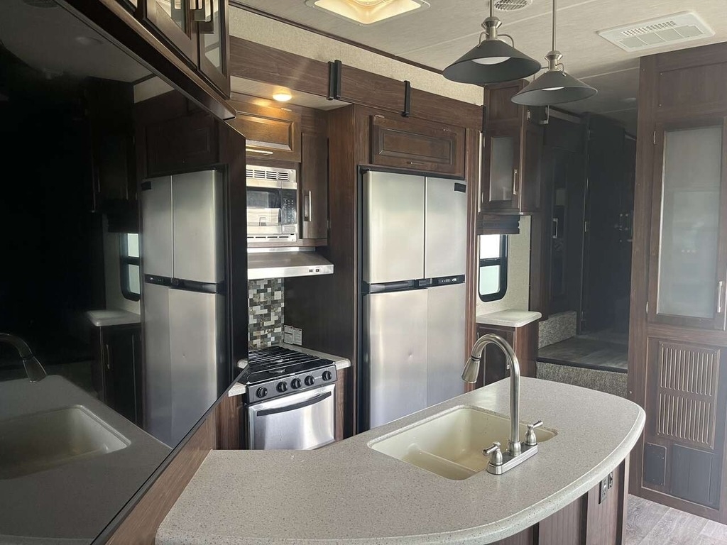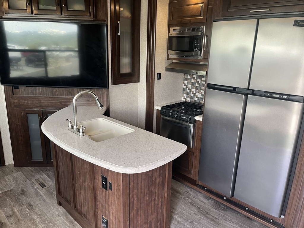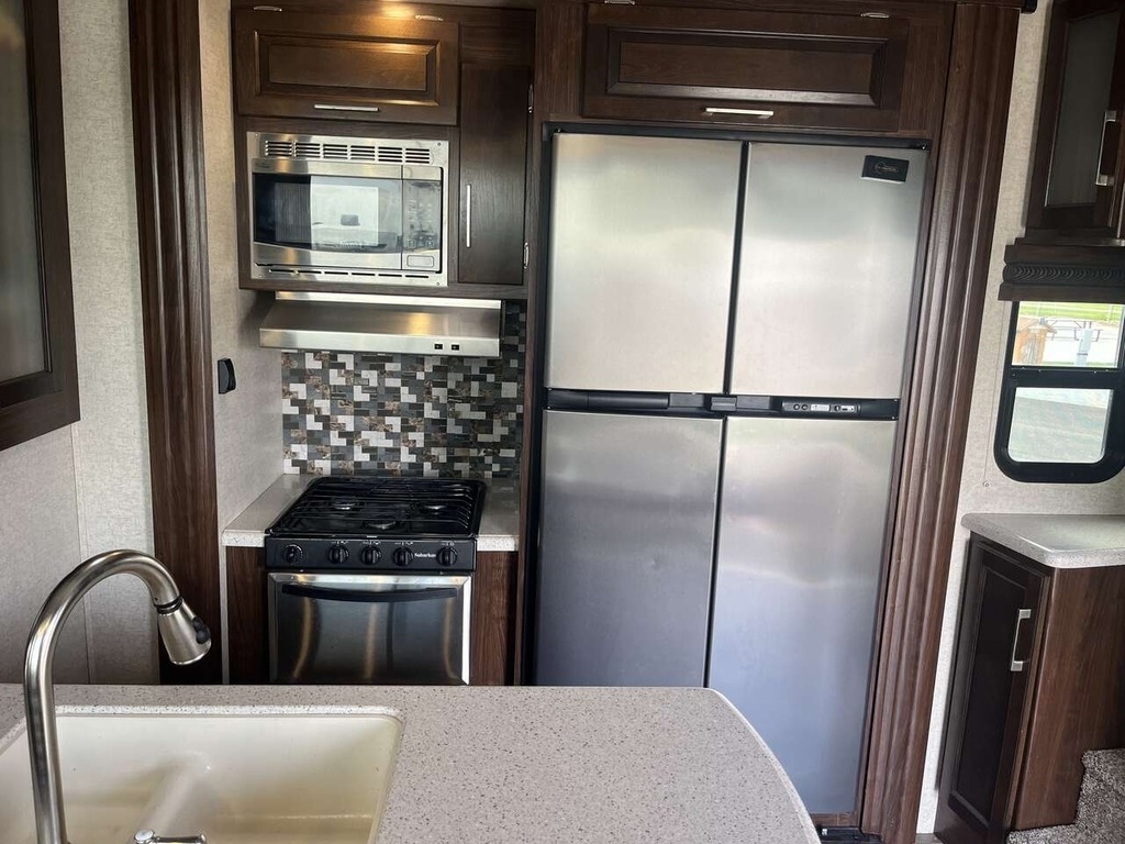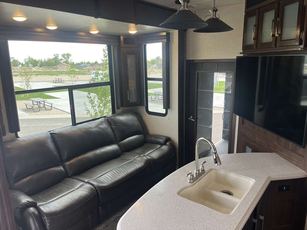 The trailer also offers a full kitchen with a large refrigerator, stove, microwave, and abundant storage. There are two table areas for games and dining, and the 2 recliners in the leather couch provide additional sleeping space and comfort.
