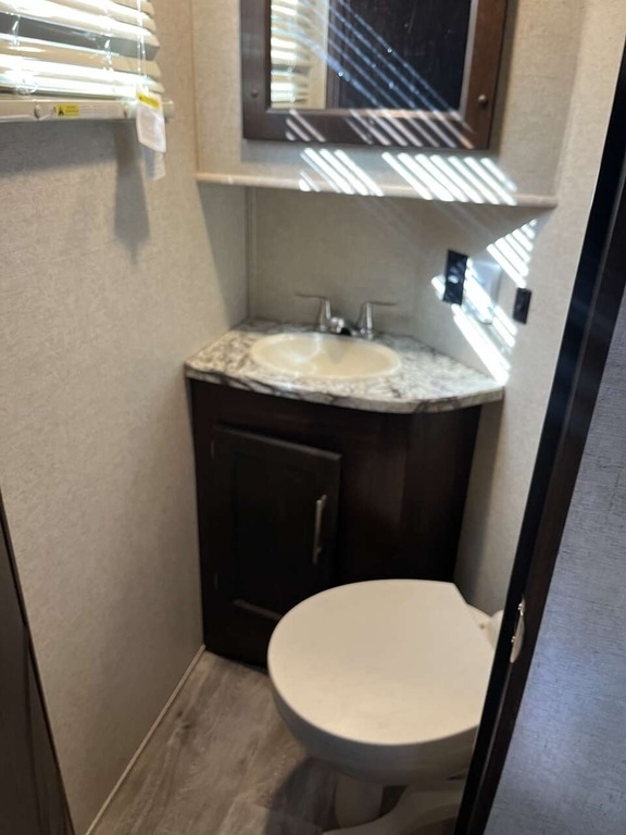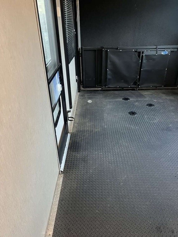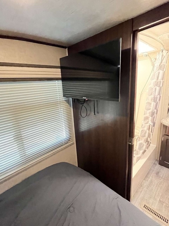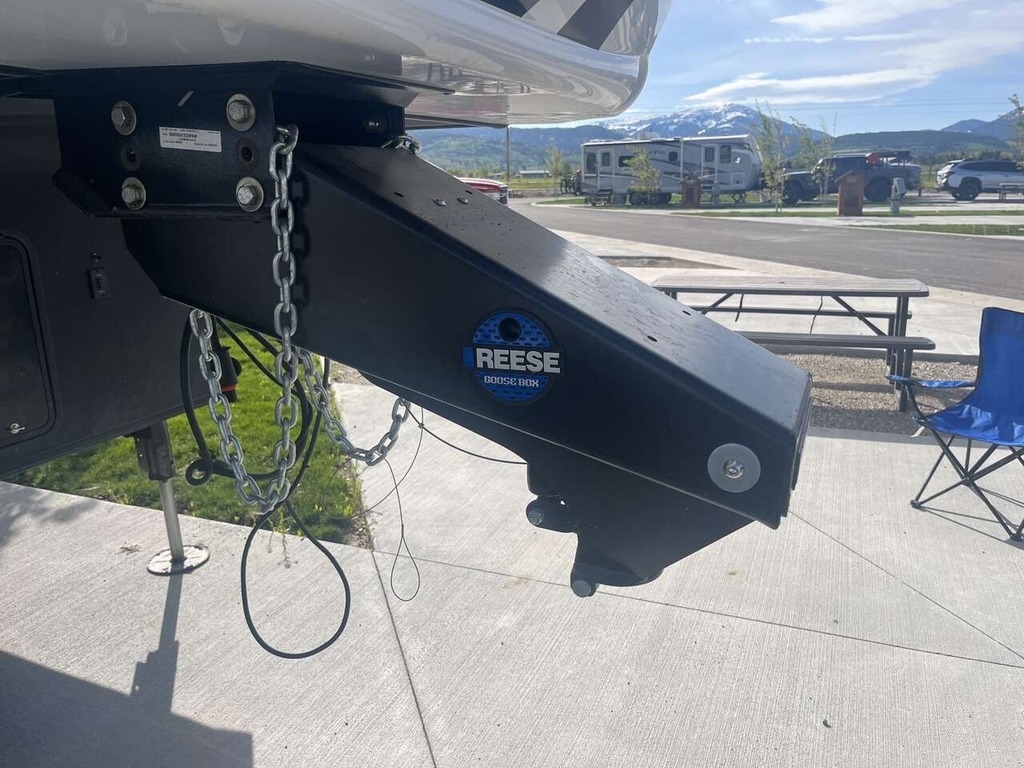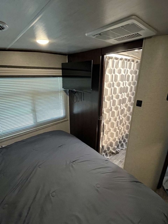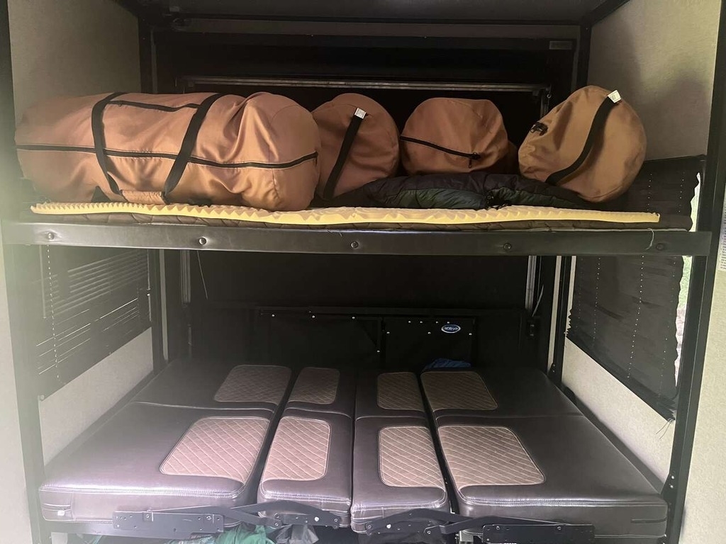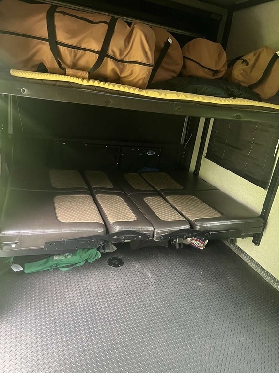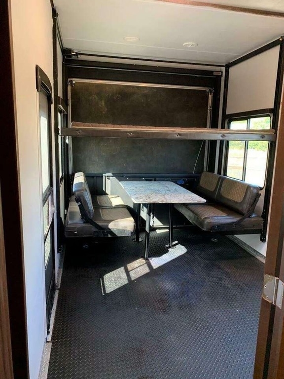 The bunk room transforms into a charming sitting room with 2 couches and a table when the beds are stowed away, while the bedroom offers significant spaciousness. With 3 roomy slides, 2 bathrooms, 2 TVs, 2 doors for entry, and room for approximately 3 Harley Davidsons or various other toys in the toy-hauling area, this trailer promises flexibility and functionality for your travels.