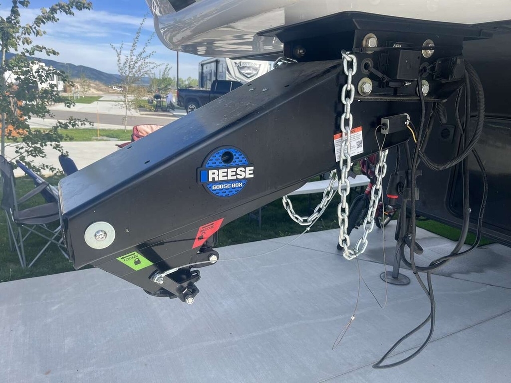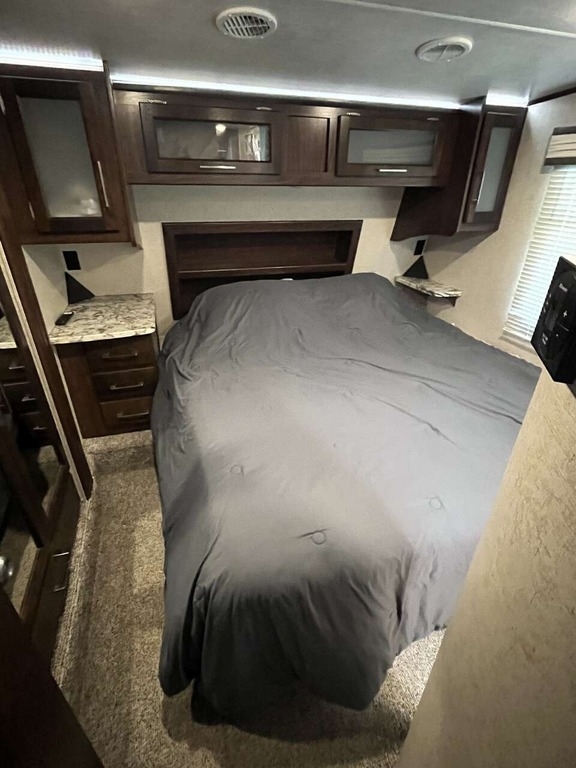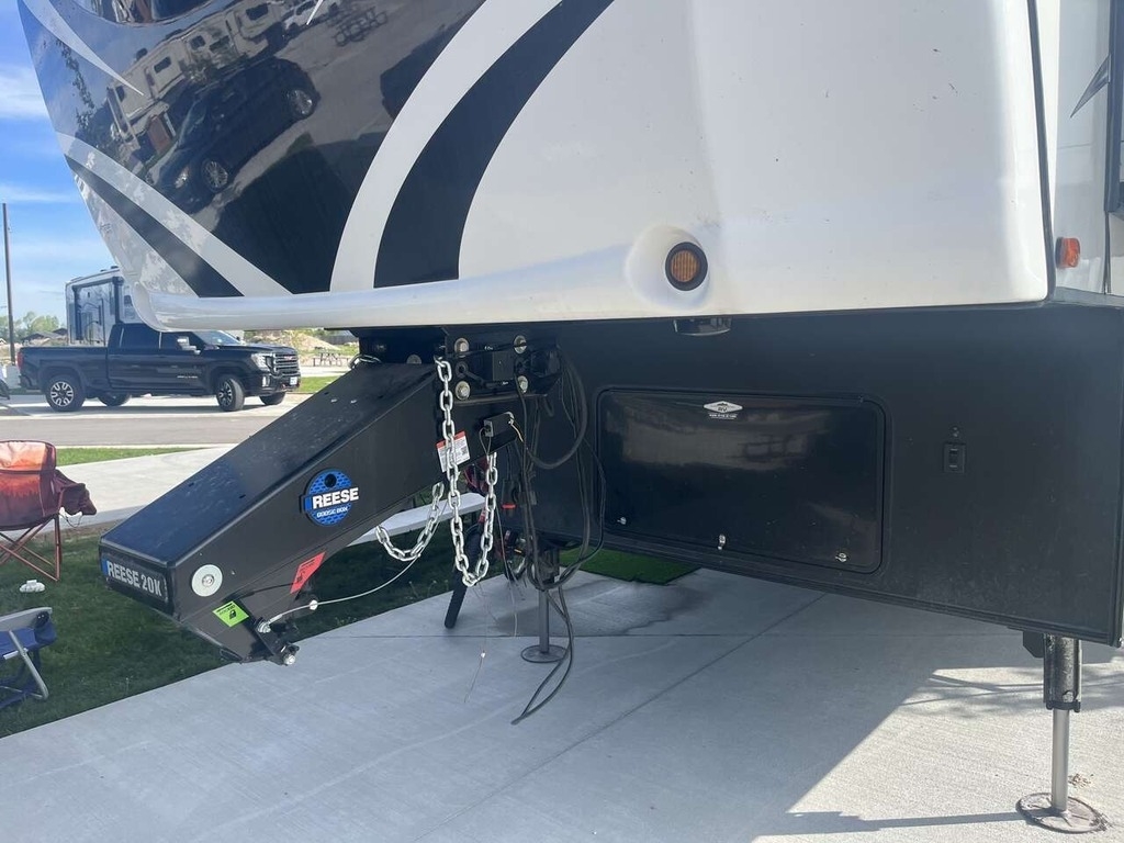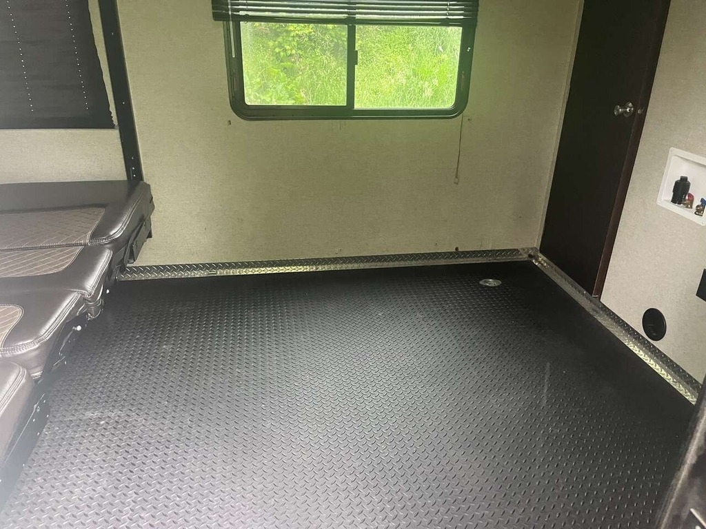 Moreover, an awesome ramp/deck with an enclosure at the back, complete with an automatic screen to ward off insects, offers an additional space for relaxation. The trailer comes with the 3 batteries it's equipped with, an indoor/outdoor stereo system, and an efficient heating and cooling system. Measuring 39 feet overall, this toy hauler is equipped to offer comfort, convenience, and a truly enjoyable travel experience.