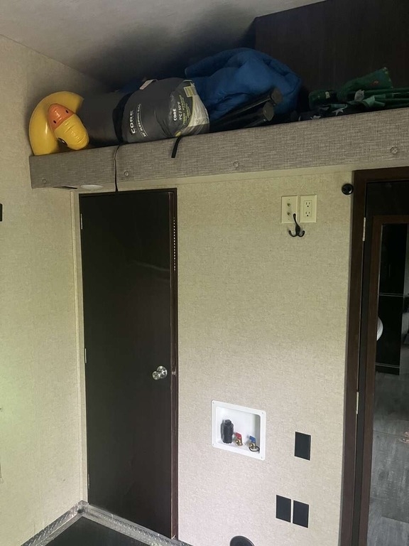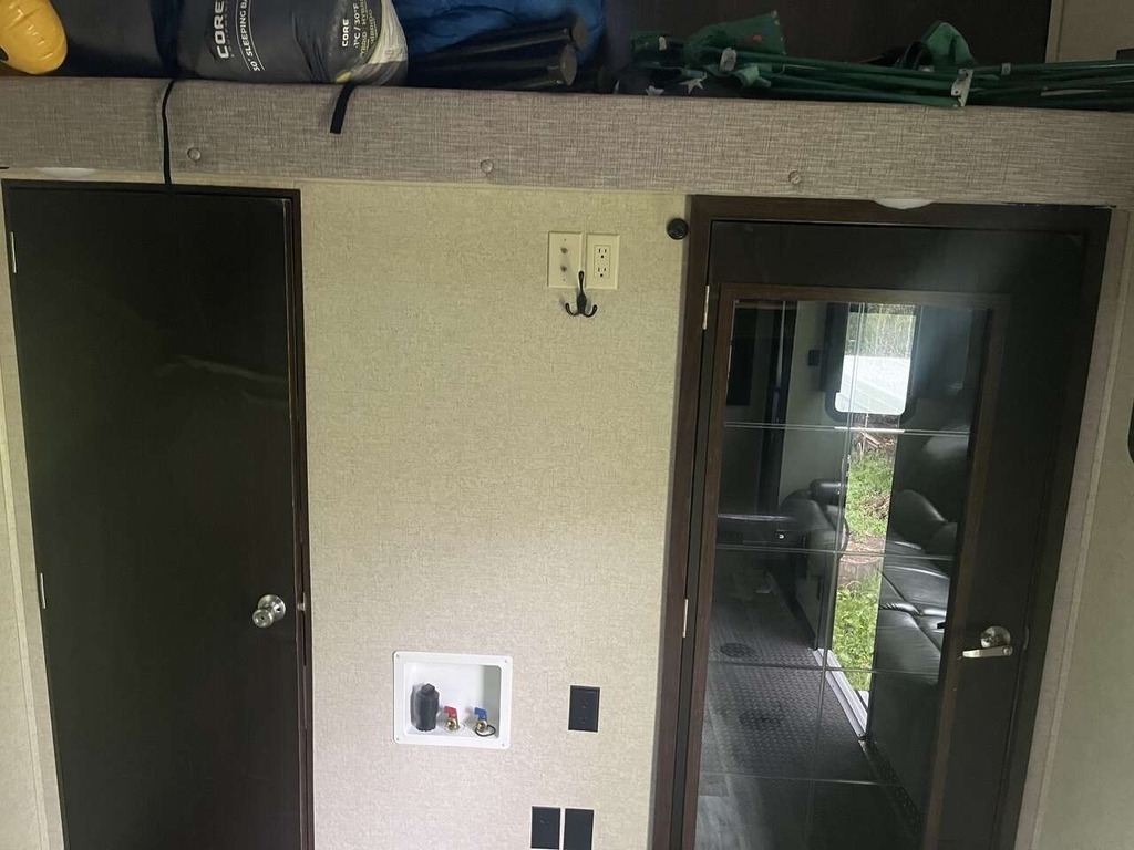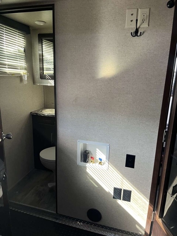 This beautiful Toy Hauler 5th Wheel is set to accompany you on your adventures. It features a King Bed and TV in the Master Bedroom, along with a bathroom, adding comfort and convenience. With 2 queen bunk beds, washing machine hookups, and an additional 1/2 bath in the toy hauler area, this unit provides versatility and ample space for relaxation and enjoyment.