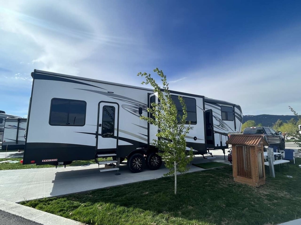 This Heartland has an overall length of 39ft and comes with a 13ft garage, 3 slide outs, 1 Awning, 2 A/C units, 2 bathrooms, Onan generator with 100 hours, RV cover, and room to sleep 8.