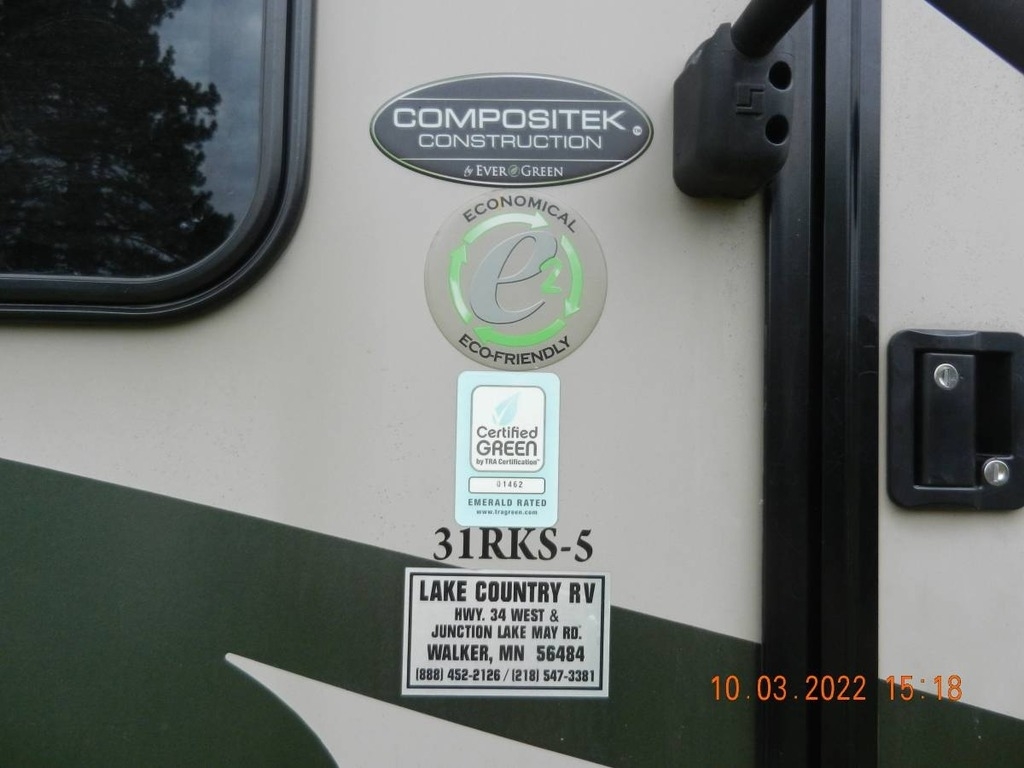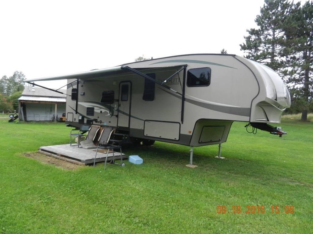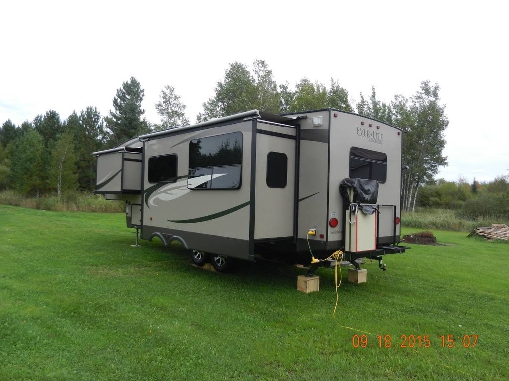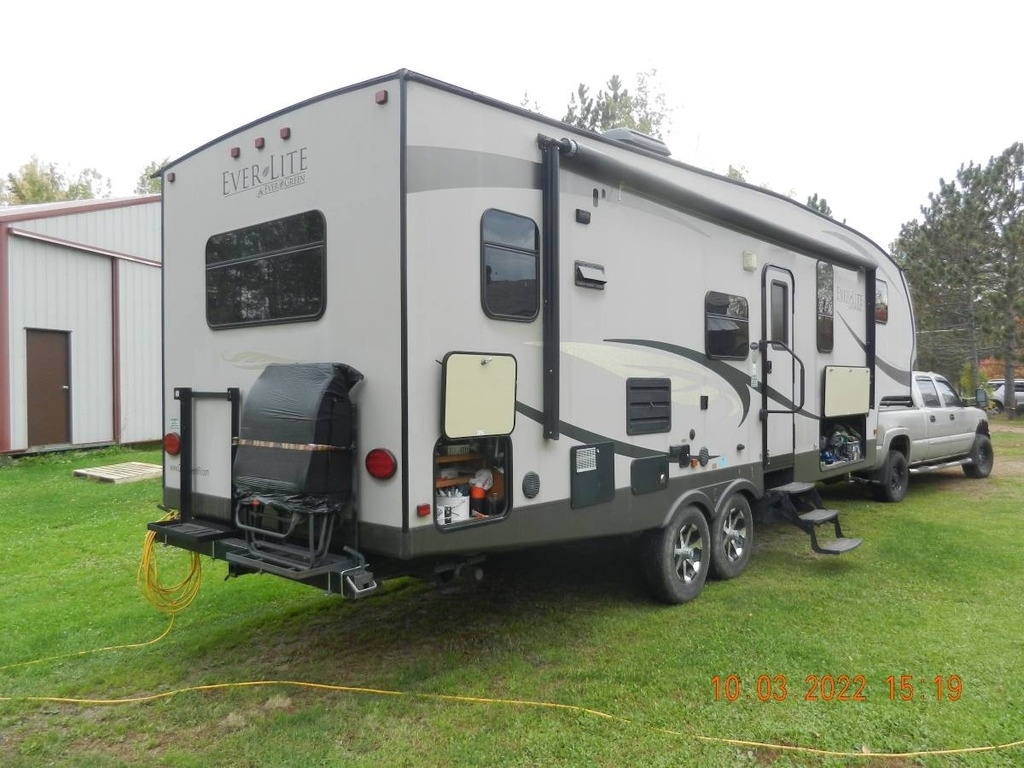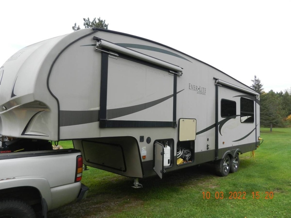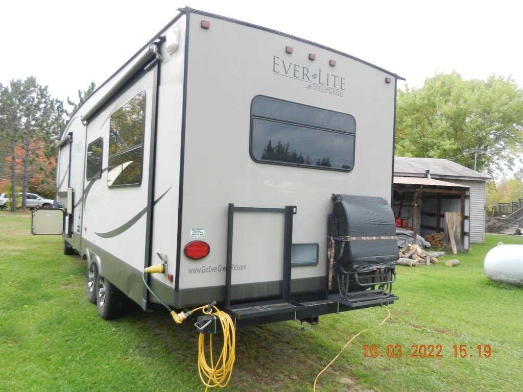 “Bought this from first owner in 2015. 1 year only on this production. Ever-Lite made by Evergreen, model 31RKS-5 , all composite, rubberized roof. Dry it still comes in at 8200 pounds. 60-gallon fresh water and 1 sewage plus 2 more dump tanks. 2 batteries and a small factory solar panel on the roof. 50-amp service, but I misplaced that cord and use a 50-amp to 30-amp adapter. All manuals included. Custom receiver hitch for towing behind the camper by the first owner. I made custom bumper mounts for (2) 0 gravity chairs and another mount for corn hole ( bean bag) boards. 2015 I also added slide awnings. Reese Revolution towing pin box swivels on camper instead of hitch making backing up camper much easier. Easy to set up on your hitch. My only complaint is the exterior finish. Even though it's stored in a poll barn every winter, decals have cracked and front cap is faded. I tried numerous times by hand to get the cap shiny. I think a buffer and the right product would work well. The camper is emptied of stuff and cleaned for sale, also just winterized for storage.