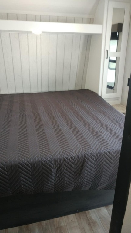 the trailer. The bedroom boasts a Queen-size bed with full sliding doors,