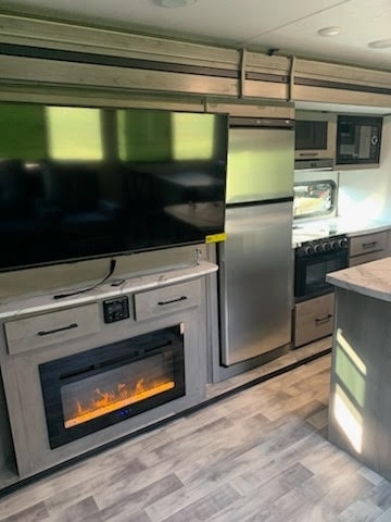 offers an impressive and spacious layout with three slide-outs, dual fireplaces (living area and bedroom), and residential-style comfort