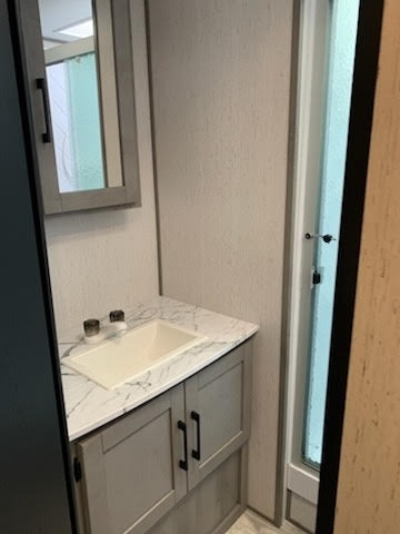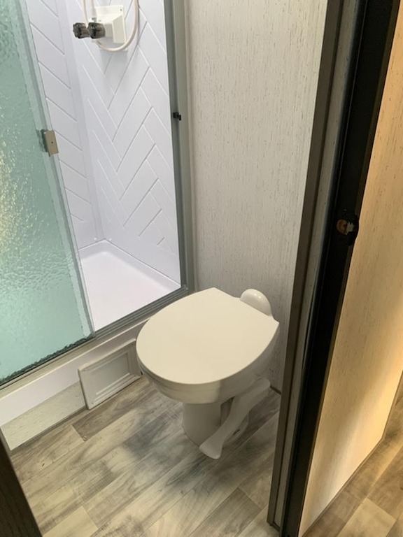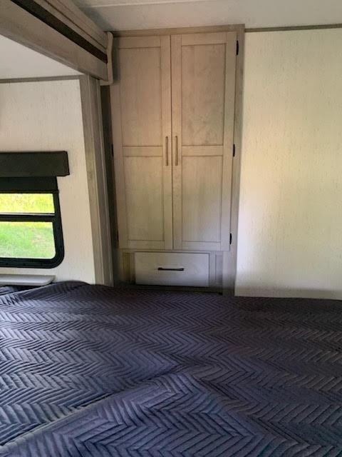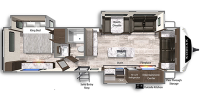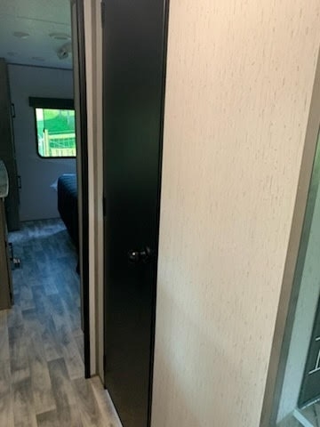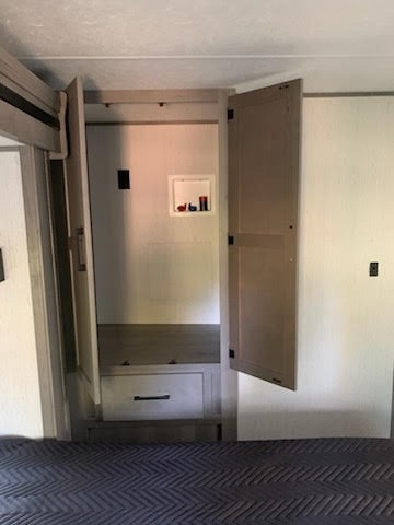 entry to the full bathroom. Outside, you’ll find a power awning, LED lighting, pass-through