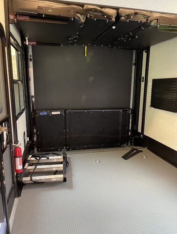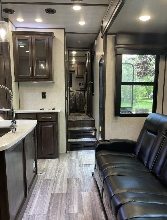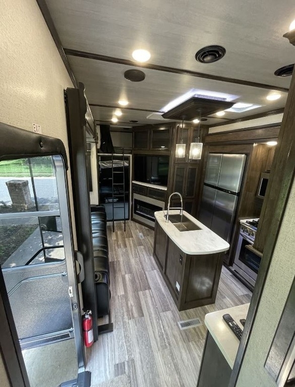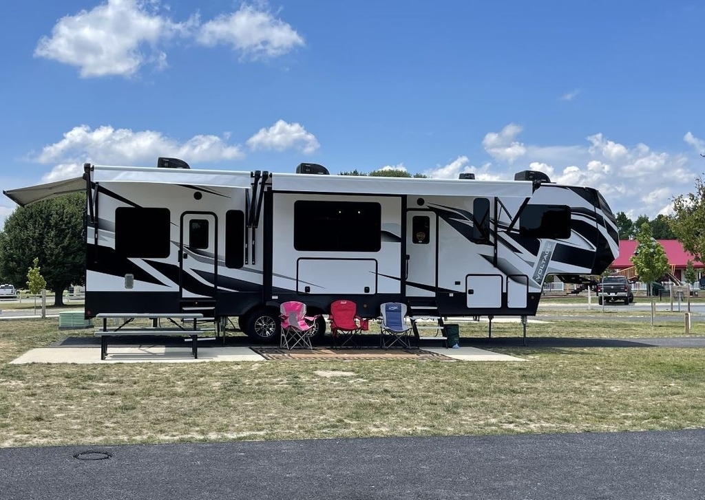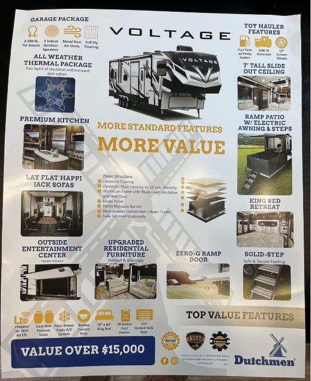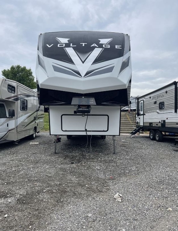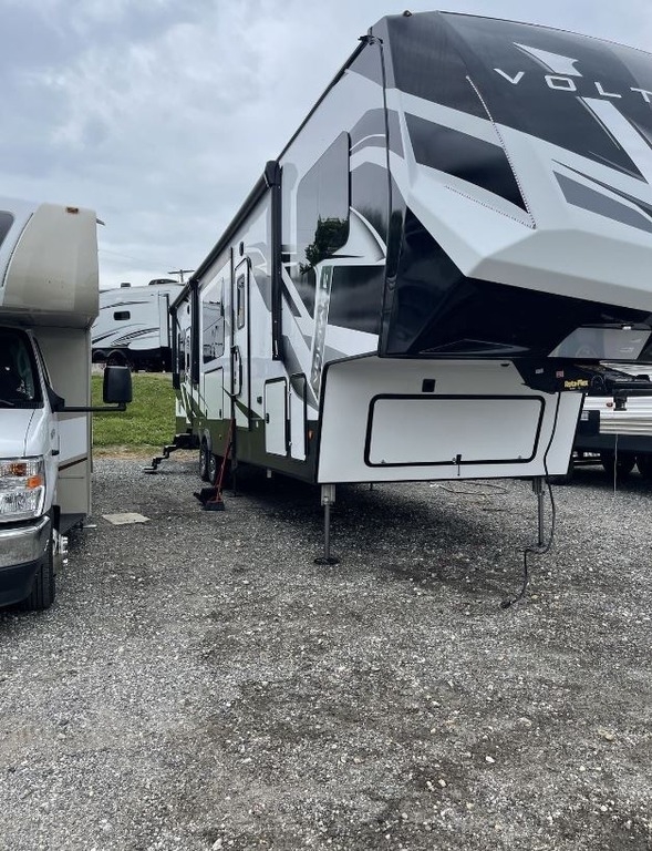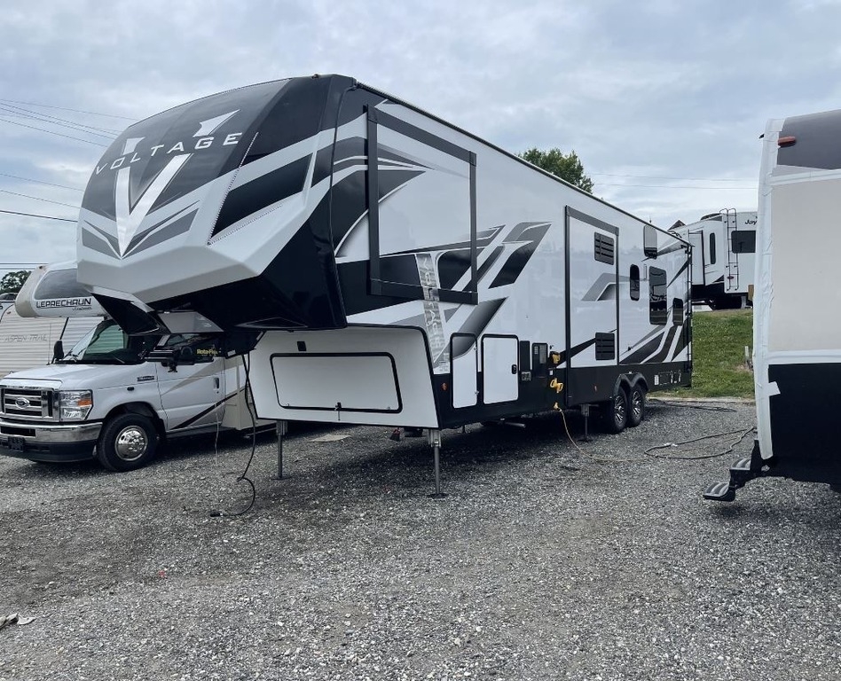 This 2021 Dutchmen Voltage 3615 Fifth Wheel Toy Hauler is 38.92 feet long and comes equipped with one and half bathrooms, three slide outs, three patio awnings, three air conditioning units, and can sleep eight people comfortably.