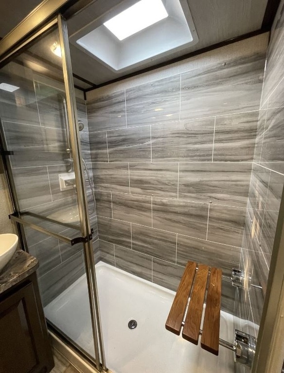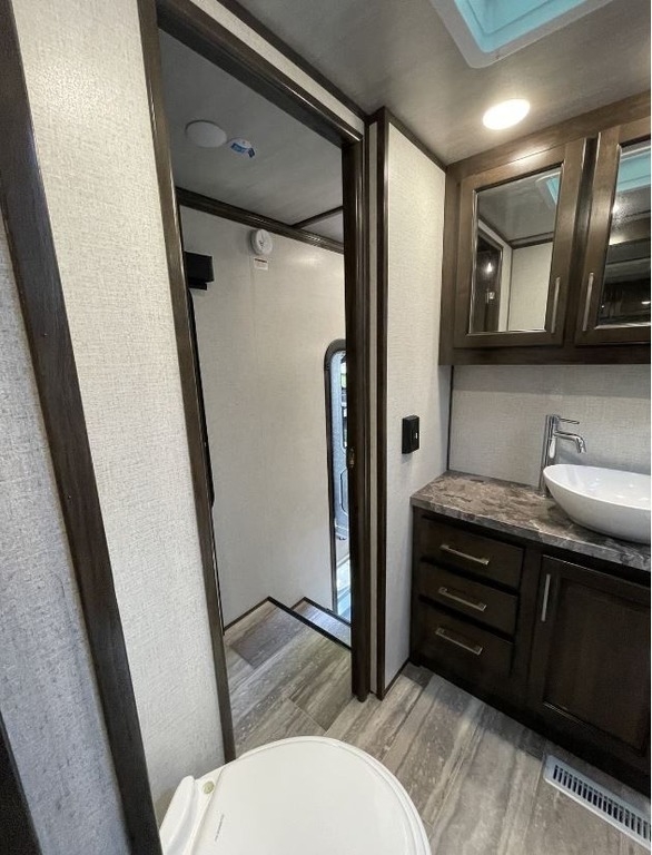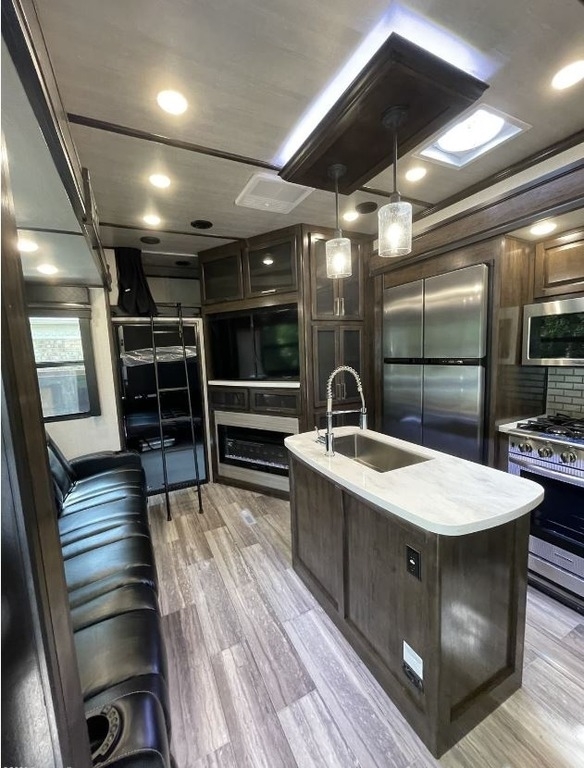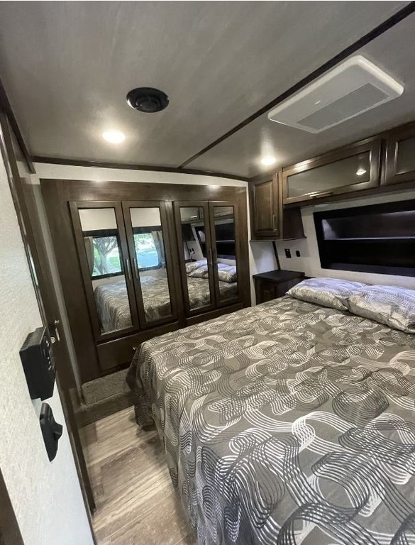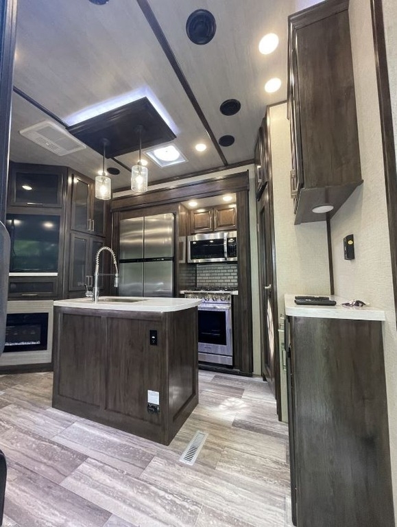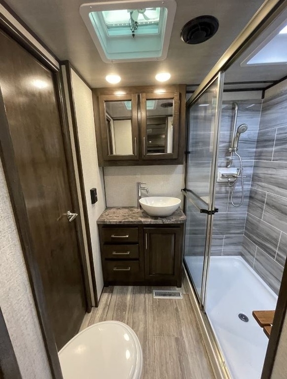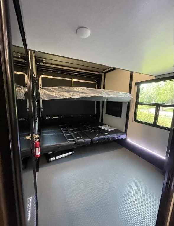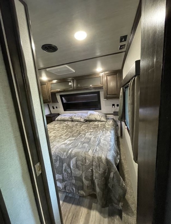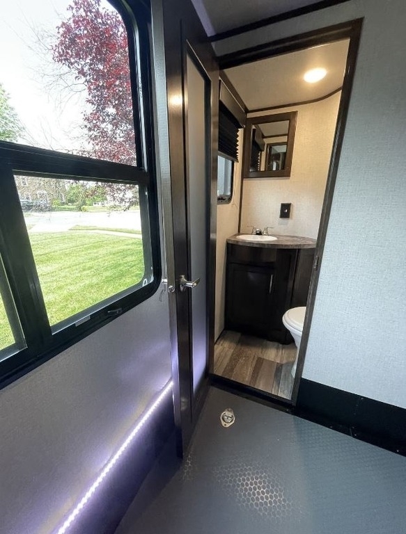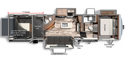 This 2021 Dutchmen Voltage 3615 Fifth Wheel Toy Hauler is 38.92 feet long and comes equipped with one and half bathrooms, three slide outs, three patio awnings, three air conditioning units, and can sleep eight people comfortably.