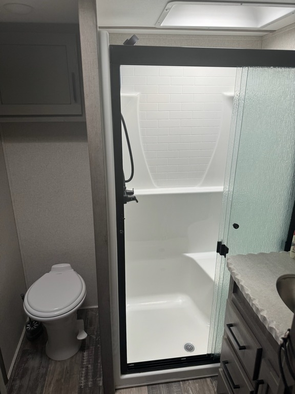 Large Bathroom with Porcelain Toilet, Spacious Shower, And Medicine Cabinet