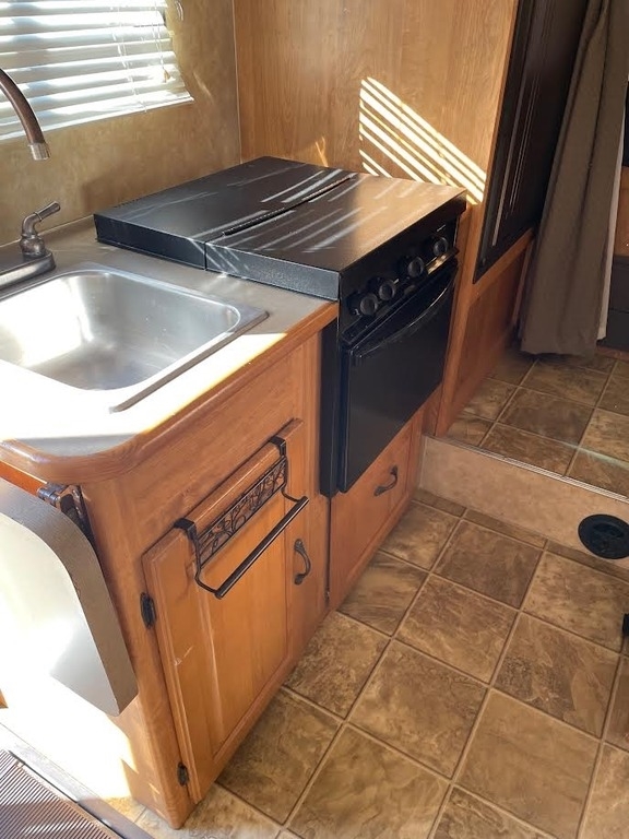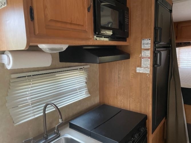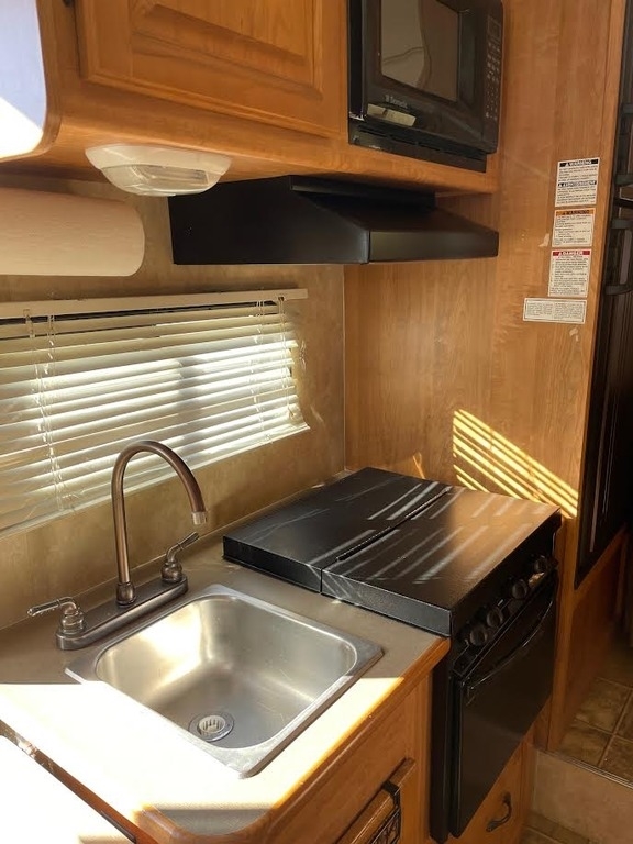 Kitchen: 3-Burner Stove with Oven, Microwave, Mid-Size Electric/Propane Refrigerator, Double Sink, And Dinette Seating