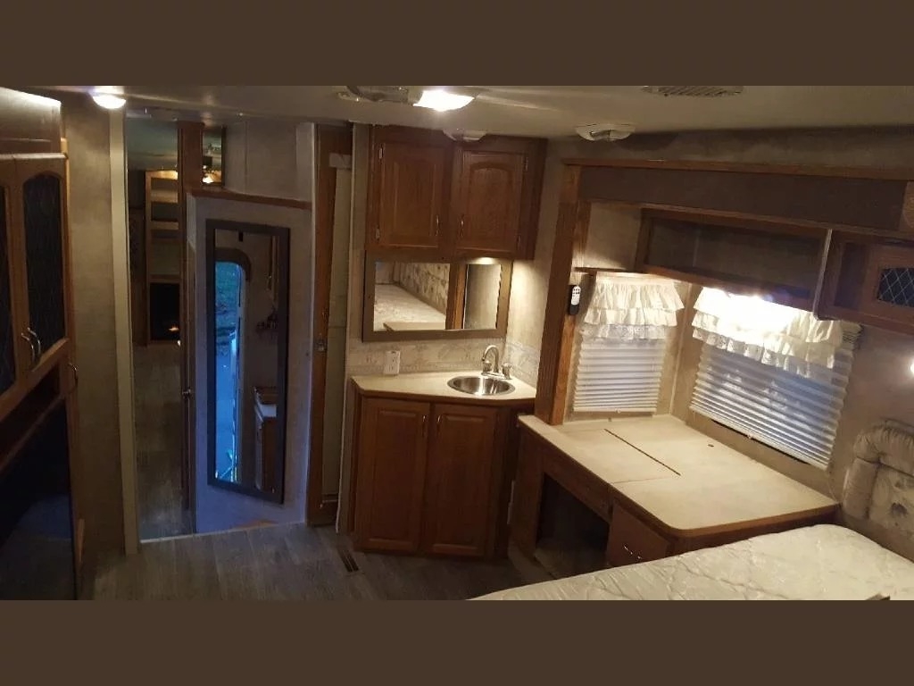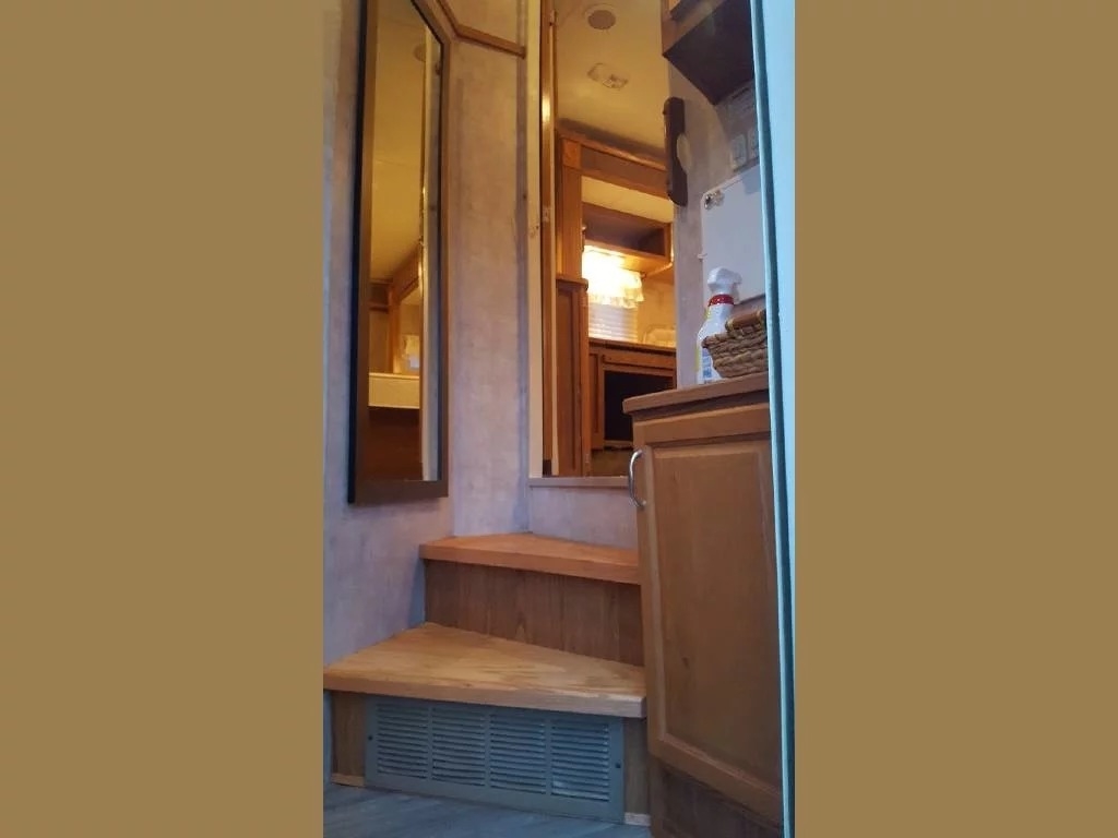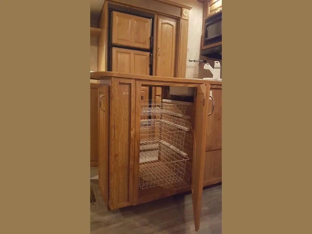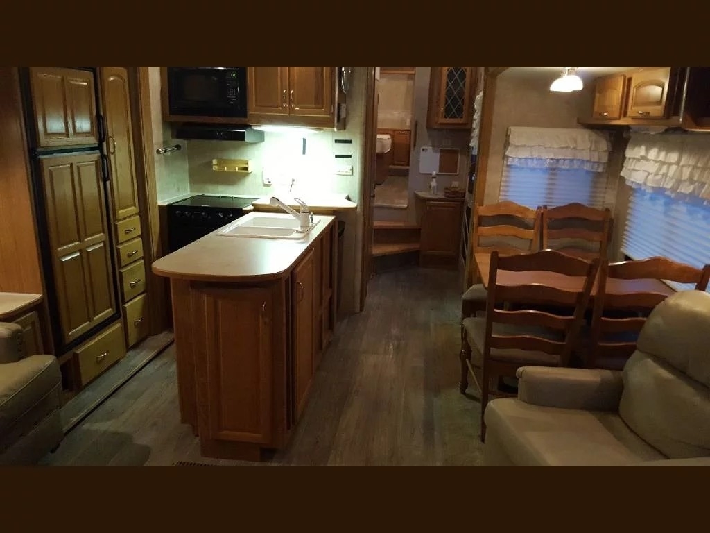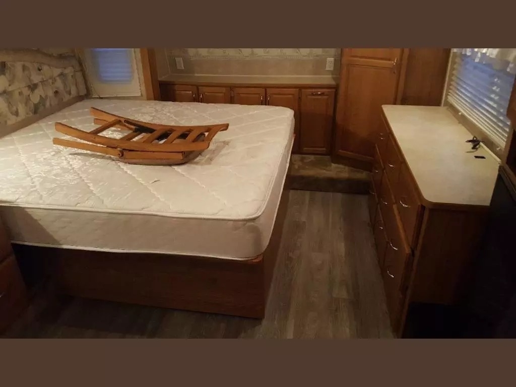 SELLERS NOTES: Shaw Ultra Resilient Vinyl Flooring (gray wood-grain) was installed last April. There are no TV’s or surround sound in the unit. There are custom window drapes throughout the coach. The awning was replaced to match the maroon trim. There is NO water damage in the unit. Included in the sale is the full length ventilated cover for the coach. The cabinetry with sink in the kitchen is adjustable. It can slide as a unit to give extra space in the kitchen or for the walkway.
