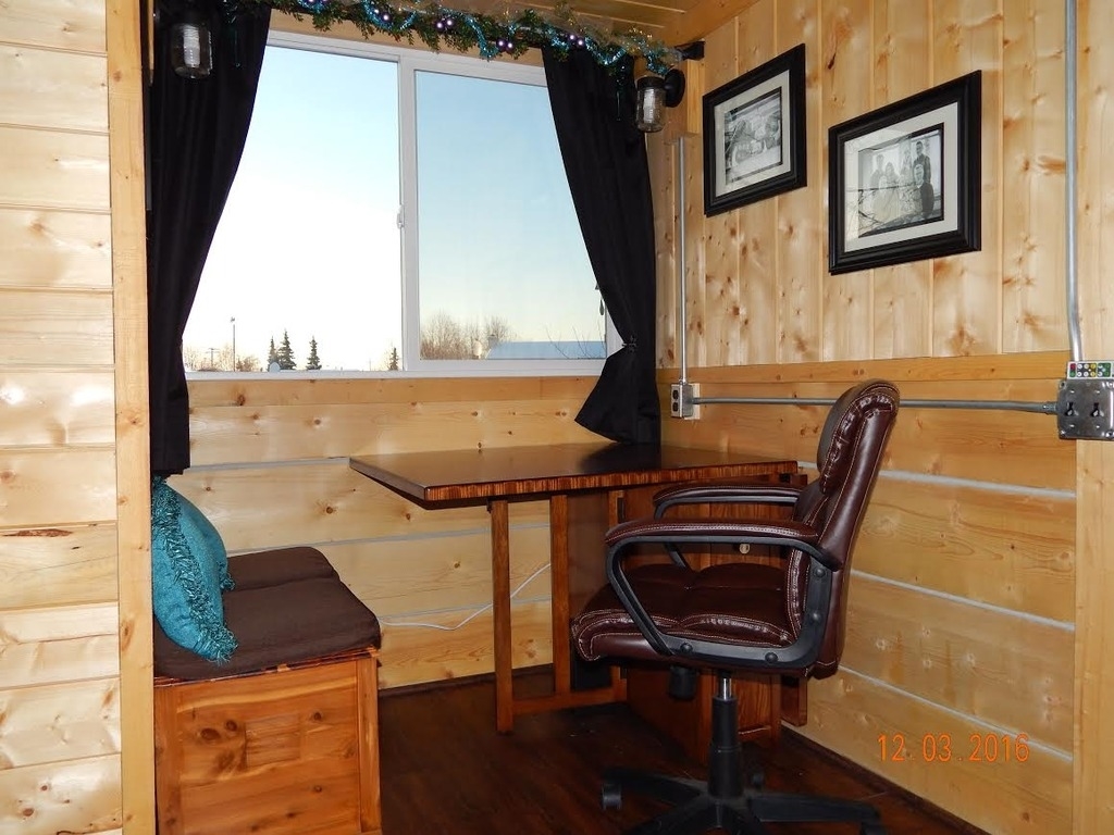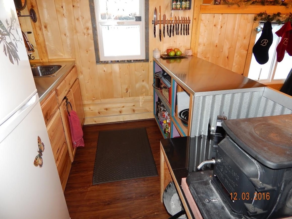 This 2015 Tiny Home was built in Alaska by Alaska Tiny Timber Homes. Equipped for comfortable living. No loft sleeping in this design! The RV queen-sized bed rolls under the elevated kitchen to store away or be used as a couch during the day. Nicely insulated for the winters with plumbing located inside heated space. A trapdoor located in the bathroom allows for plumbing and electric breaker box access. There is a 98 gallon fresh water and a 50 gallon grey water tank. The setup is similar to an RV with a 30amp plug, water port, and drain hose. It comes fully furnished with propane heat and wood stove, propane on demand tankless water heater, apartment sized refrigerator, bathtub/shower, retractable loft ladder, and possible single sleeping loft. It has a double drop-leaf table that accommodates 6 people. The kitchen has stainless steel countertops. Also included, is a 3-in-1 combo electric stove (oven/grill/coffee maker), single electric burner, mini- popcorn popper, mini-hotpot, and mini-crockpot. There is vinyl plank flooring throughout. This tiny has an Arctic entrance too! Outside skirting with double barn-style doors for easy access to storage underneath the home. Four leveling jacks also come with this tiny. ALL the logs, wood used was hand milled. No box-store stuff. All wood and logs are hand milled Alaska sourced, white spruce, sitka spruce, fir and birch.