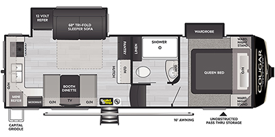 This Keystone has an overall length of 27.92 feet and comes equipped with 2 power retractable slide-outs, 1 power retractable awning, 1 A/C Unit, a generator, and plenty of room to sleep 6. This unit has been well-maintained.
