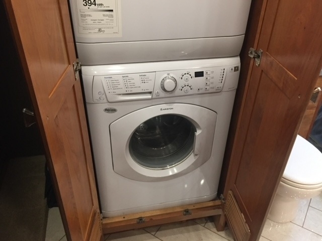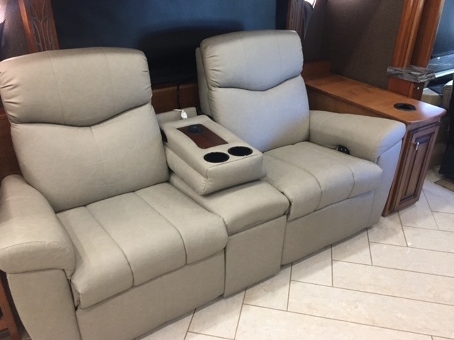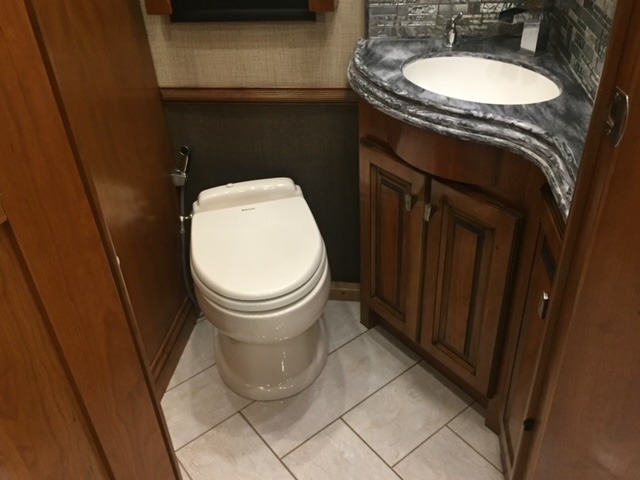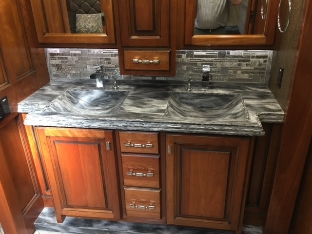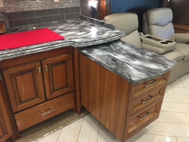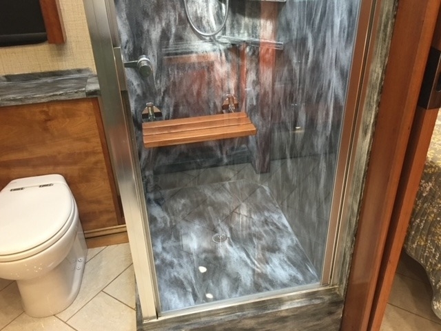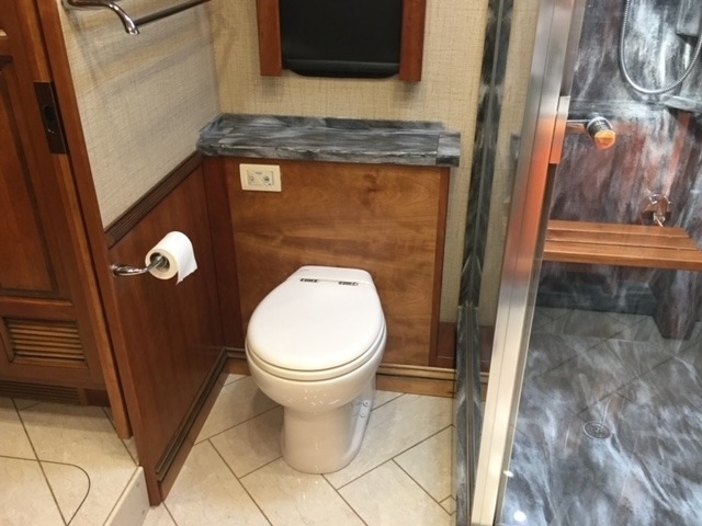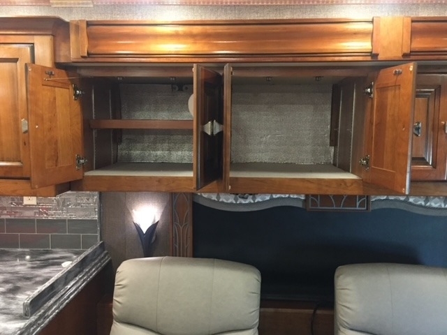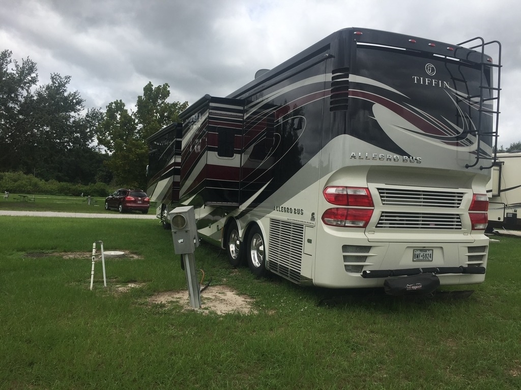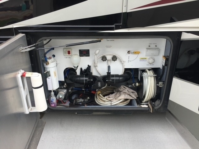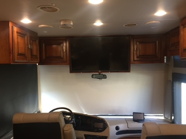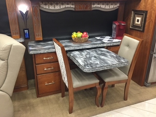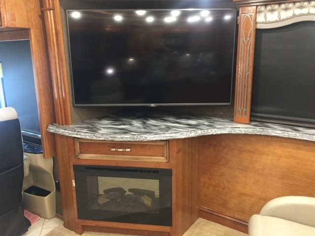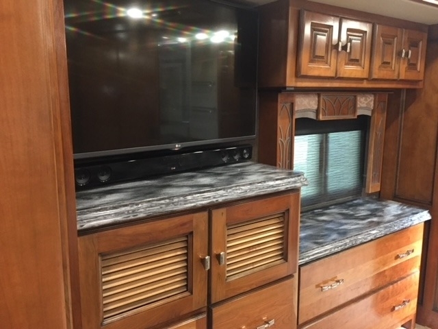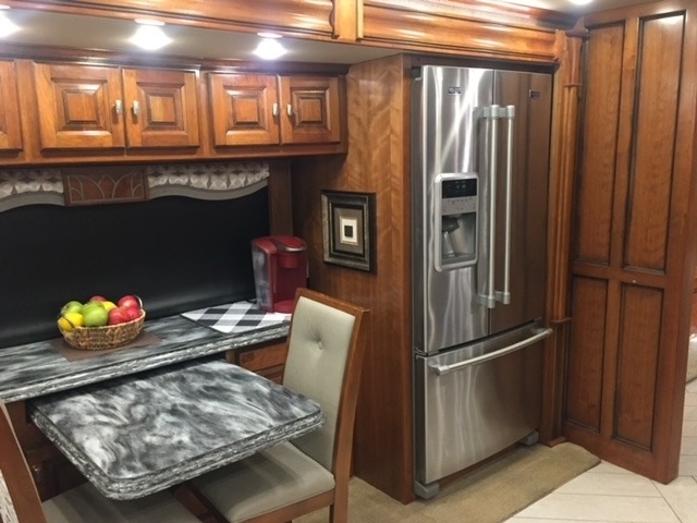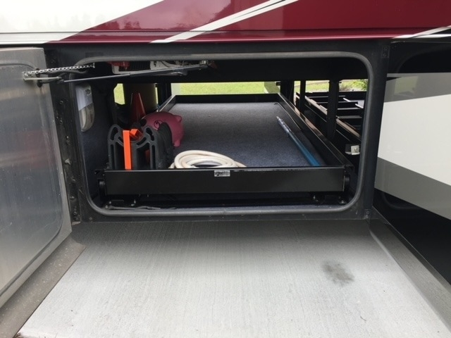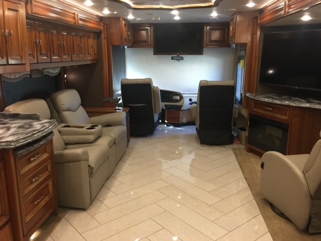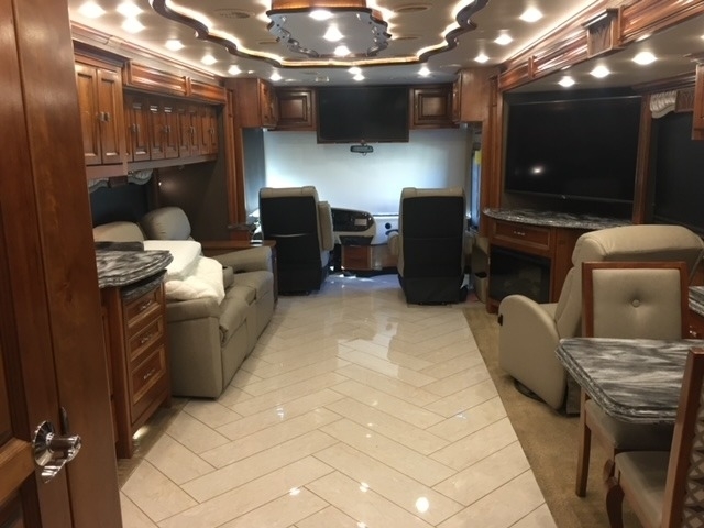 45 feet long and comes equipped with four slide outs, a patio awning, three air