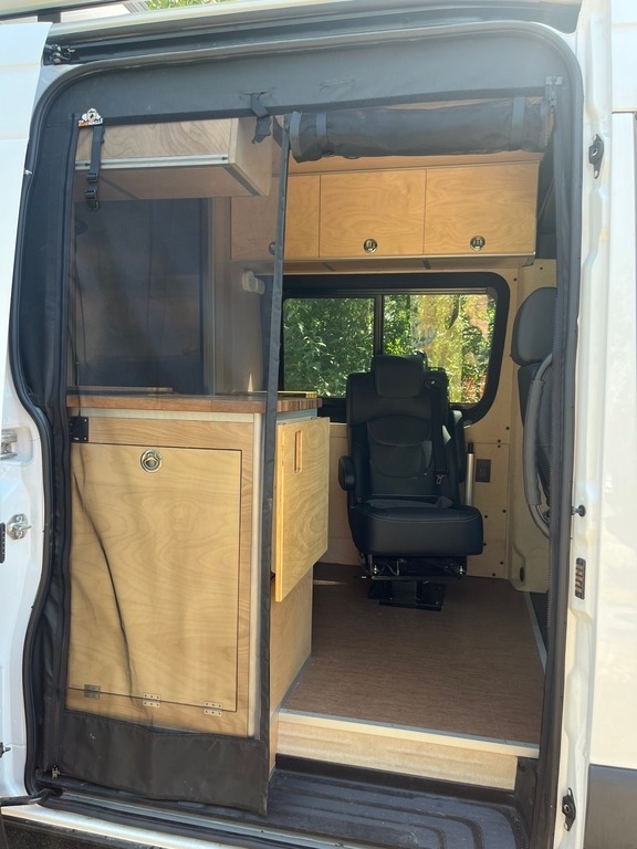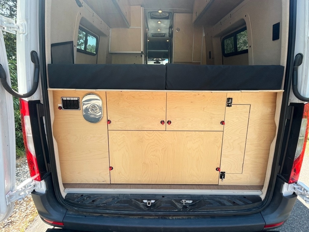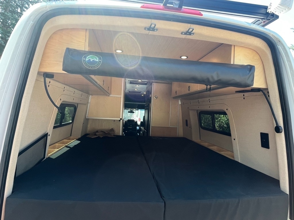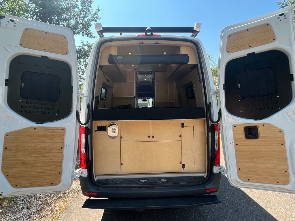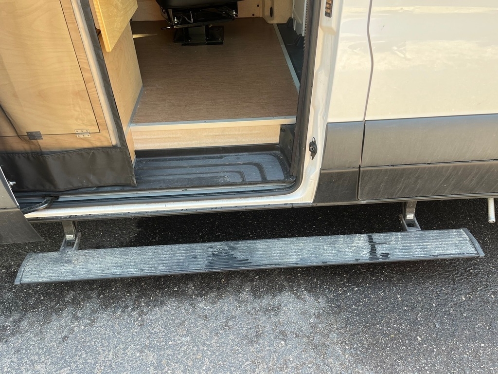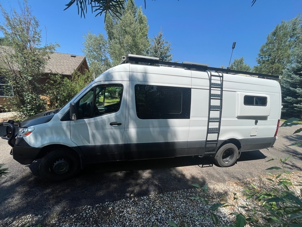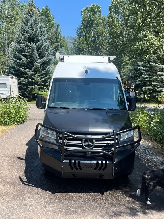 TDK Mayhem front bumper, Steel; AM Auto screened half slider window - passenger side sliding door; AM Auto screened half slider window - driver-side front panel; Flarespace side bump-outs with Flarespace 33” x 10” half-slider windows and screens; Flarespace fiberglass rear window vent kit with 15” x 18” half-slider windows and screens; Fiamma F65 Eagle electronic awning; Agile Offroad RIP suspension upgrade kit and 2” lift; Flatline Van co side ladder; 15-Series extruded aluminum custom roof rack; ARB onboard air compressor, engine chamber mounted with exterior hookup; Mercedes 47-gallon extended range fuel tank; Amp Research PowerSteps, driver door, passenger, and slider; Custom roof rack fairing; Black Oak LED roof rack mounted off-road/camp lights (x4).