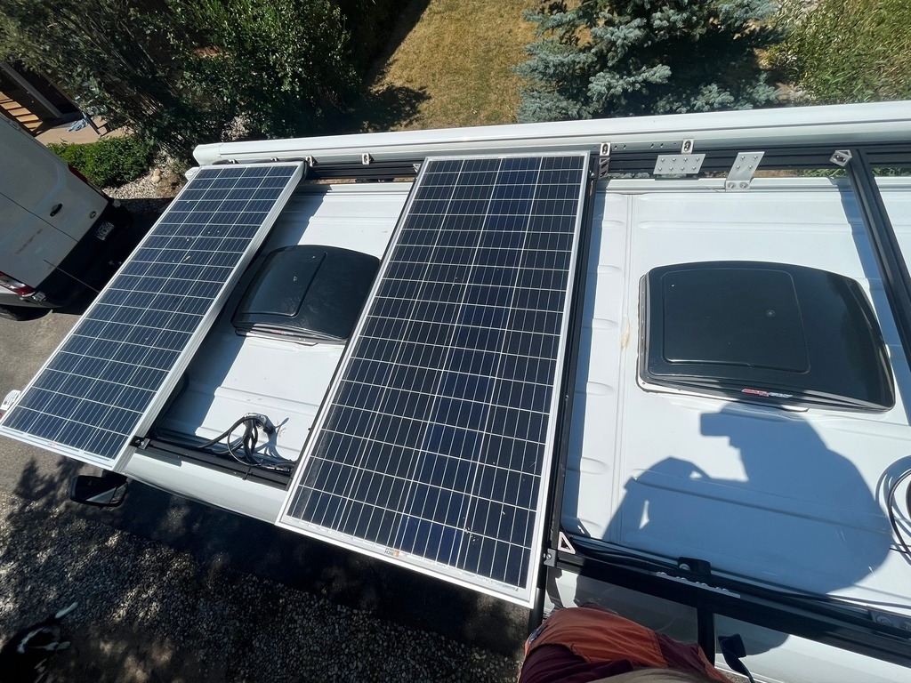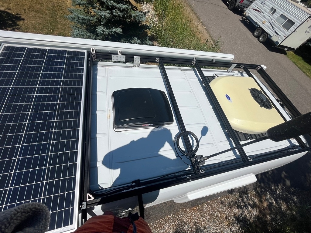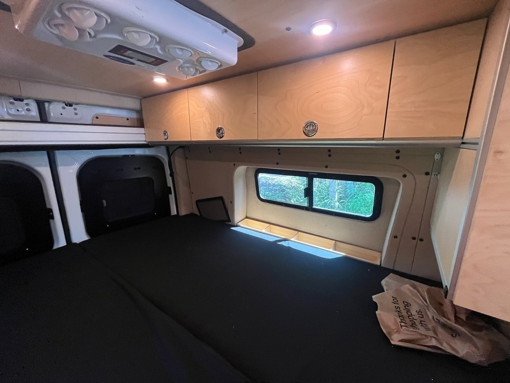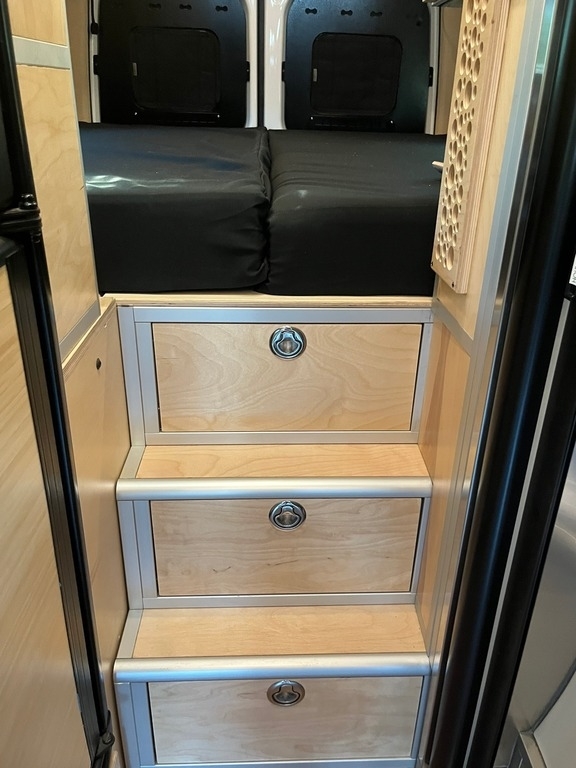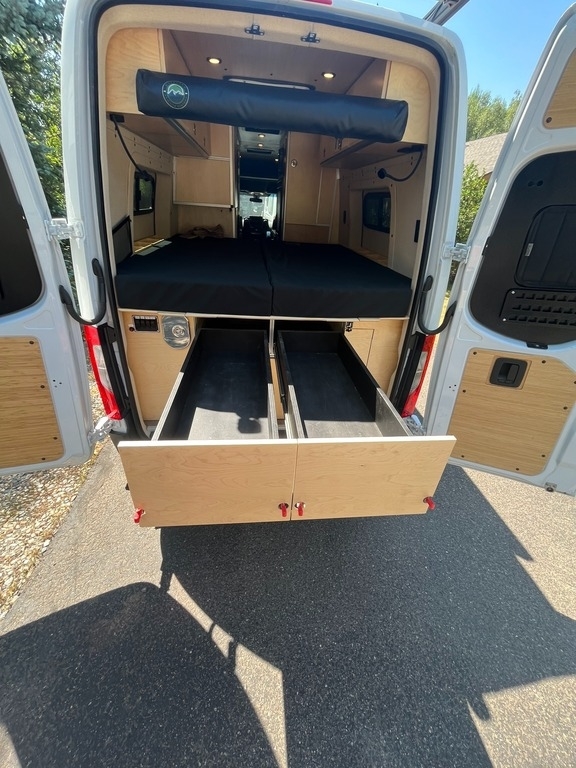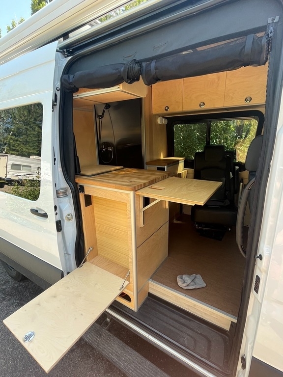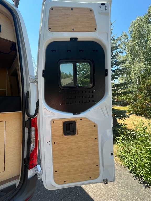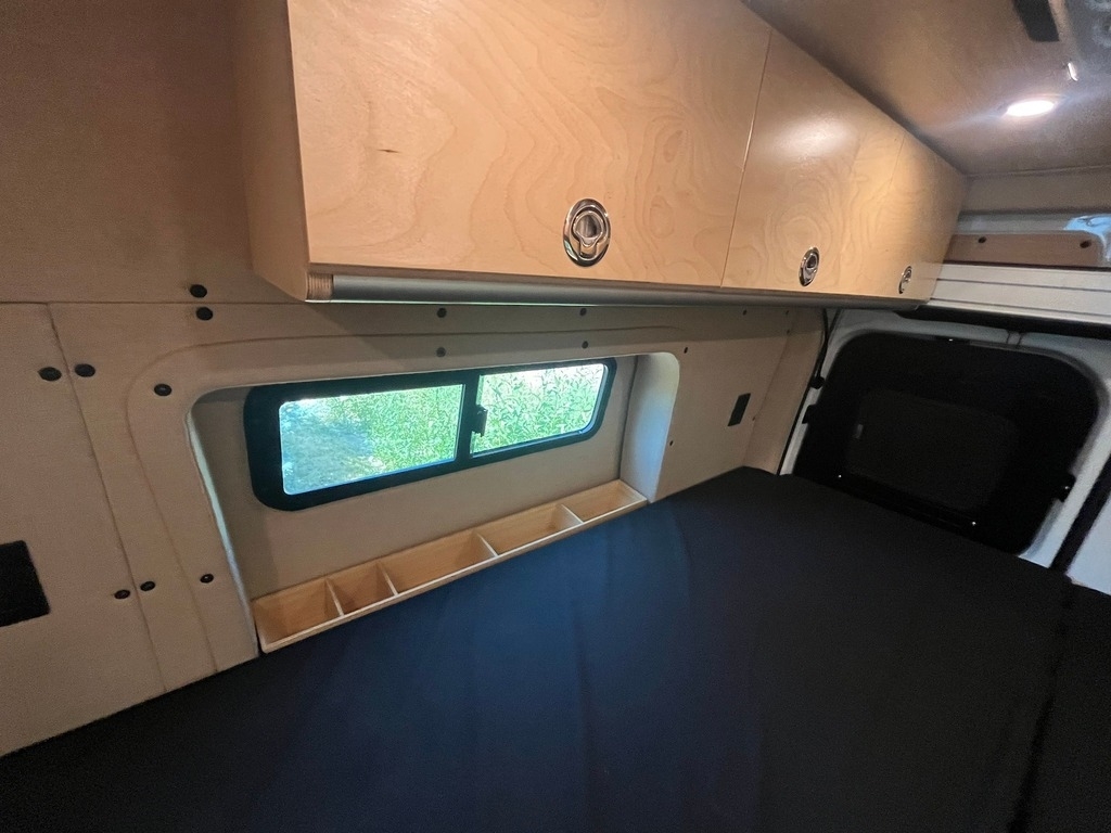 TDK Mayhem front bumper, Steel; AM Auto screened half slider window - passenger side sliding door; AM Auto screened half slider window - driver-side front panel; Flarespace side bump-outs with Flarespace 33” x 10” half-slider windows and screens; Flarespace fiberglass rear window vent kit with 15” x 18” half-slider windows and screens; Fiamma F65 Eagle electronic awning; Agile Offroad RIP suspension upgrade kit and 2” lift; Flatline Van co side ladder; 15-Series extruded aluminum custom roof rack; ARB onboard air compressor, engine chamber mounted with exterior hookup; Mercedes 47-gallon extended range fuel tank; Amp Research PowerSteps, driver door, passenger, and slider; Custom roof rack fairing; Black Oak LED roof rack mounted off-road/camp lights (x4).