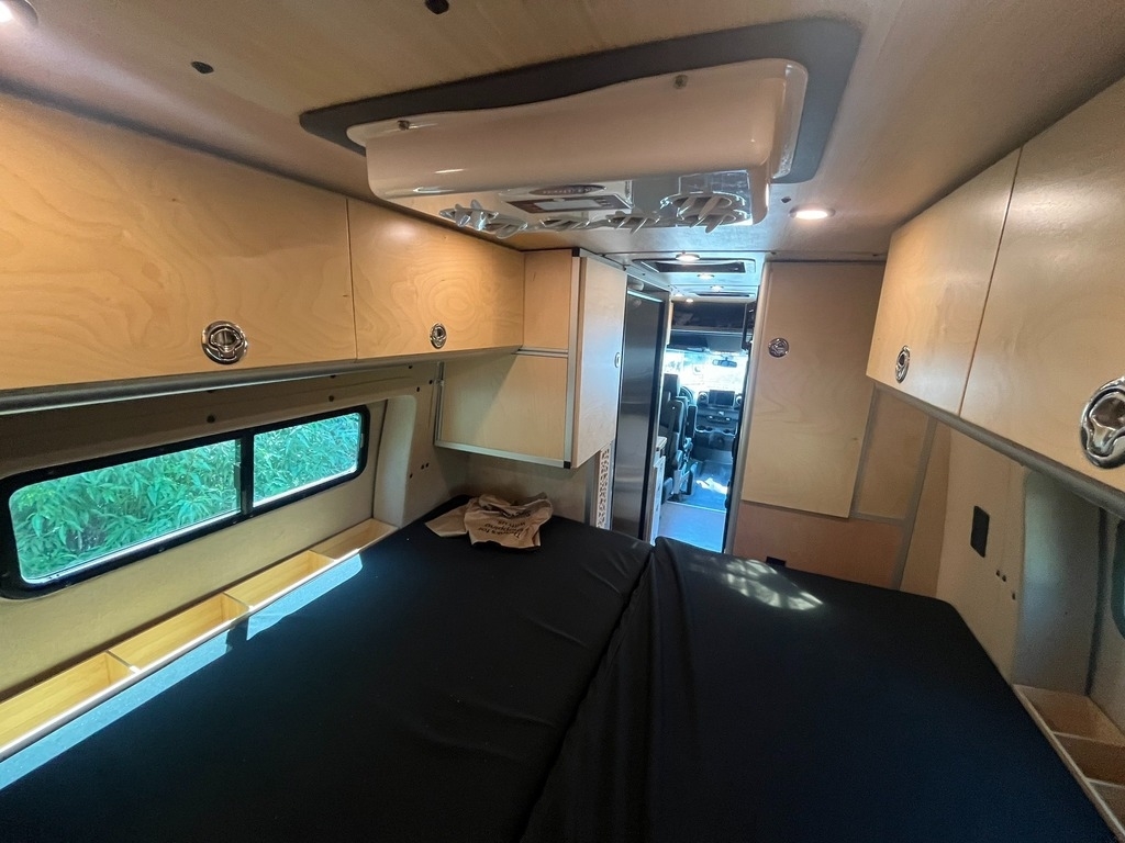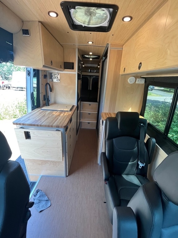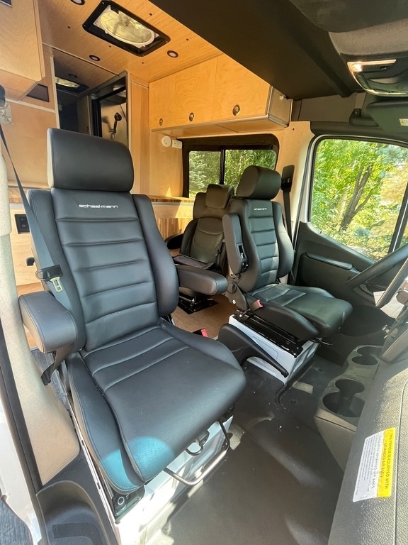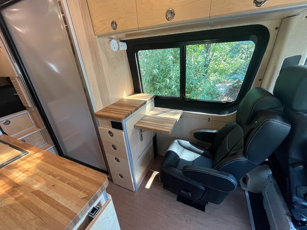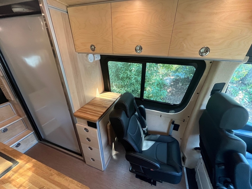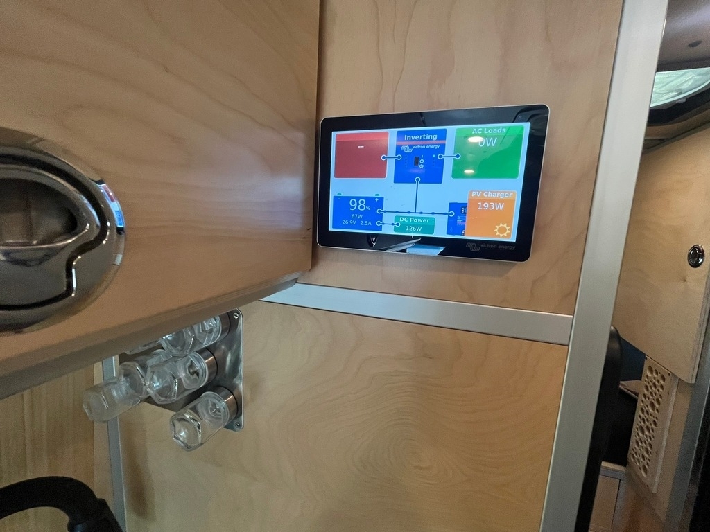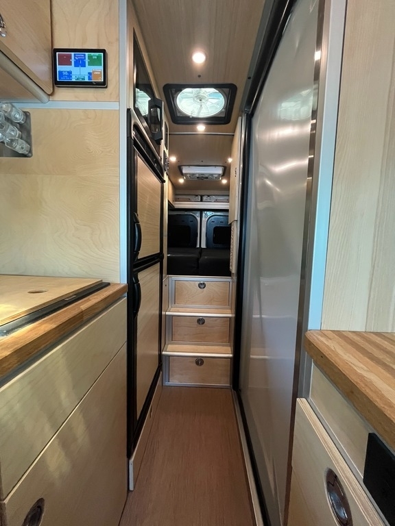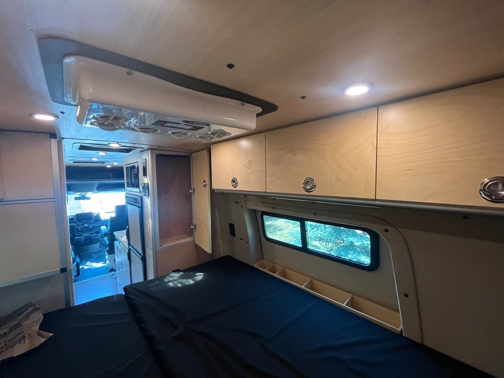 Victron 24v electrical system; 600Ah battery bank; Multiplus 2 24v 3000-watt inverter/charger; 400-watt PV solar array 24v; Accessory alternator for DC-DC charging; Advanced battery monitoring system - Cerbo GX and Lynx Smart BMS 500 with touchscreen display; Scheel Mann electronic heated driver and passenger seats with Scopema 360-degree swivels; CVC-VIP Captain’s seat black leather on swivel and sliding track, DOT-approved; Ruvati 16” drop-in kitchen sink, composite with custom countertop insert; Alpine Halo 11” touchscreen digital multimedia receiver; AquaHot 125D Hydronic heating system with 3 cab-mounted zone heaters and touchscreen display; Mabru RVSC 12000 BTU 12v air conditioning unit; Frigo Designs stainless steel shower with retractable door, 40” x 21” x 75”; TMC Marine quiet-flush electric toilet; NorCold 7 Cubic foot 12v fridge/freezer; Webasto Air Top 2000 STC diesel heater, under passenger seat mounted with smartcontroller; Uponor PEX-A plumbing system; 38-gallon fresh; 20-gallon black tank; 21-gallon gray tank; Raritan 12v macerator pumps with electric solenoid valves for gray and black tank dumps; Dual Maxxfan Deluxe remote control ventilation fans; 600lb heavy-duty locking drawer system for bulk storage underneath bed; LonSeal Spanish Chestnut flooring; 6” Custom 2-piece King size mattress; 2 Burner induction cooktop (Not integrated).