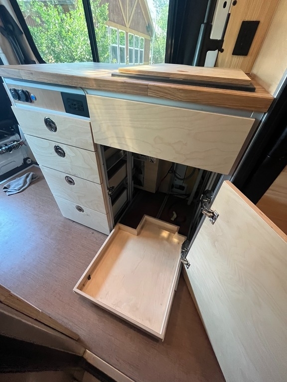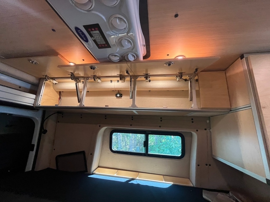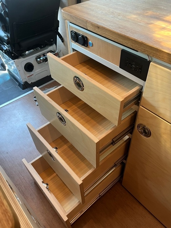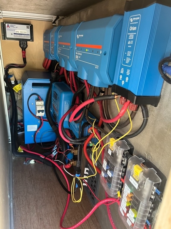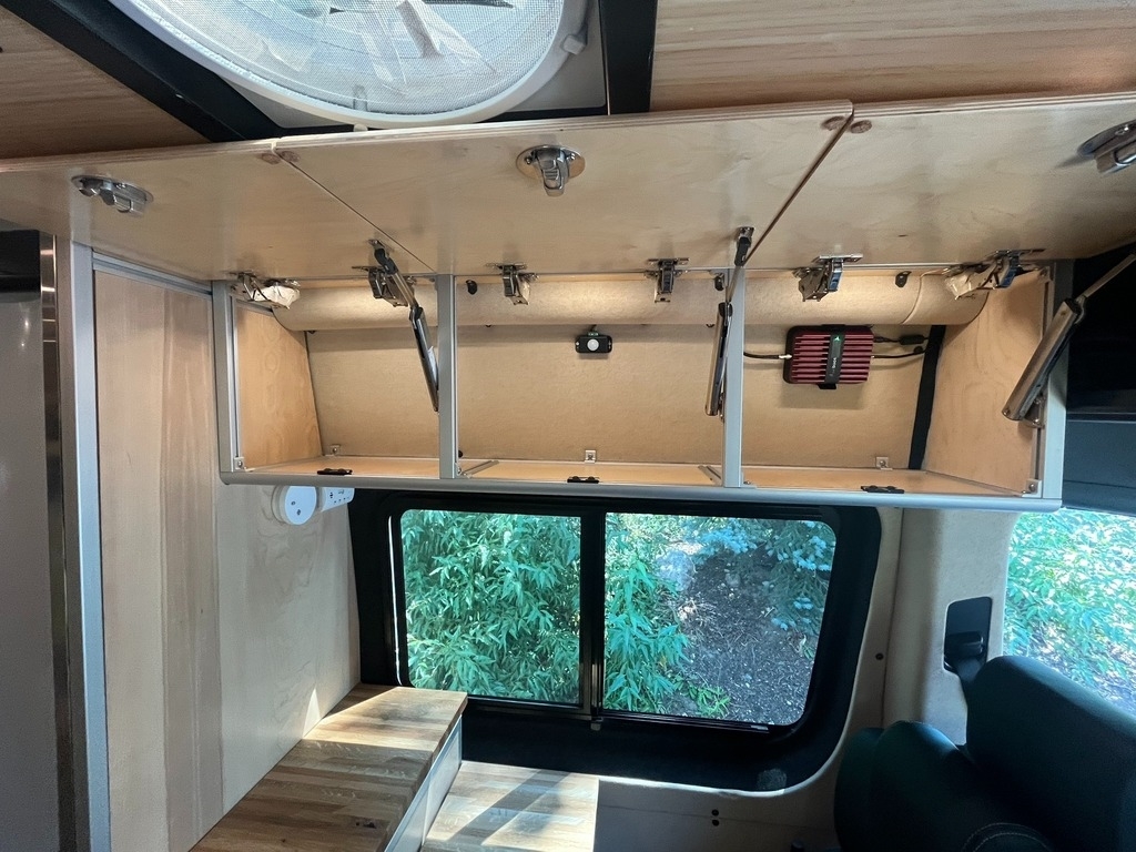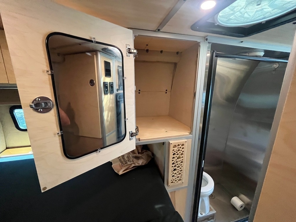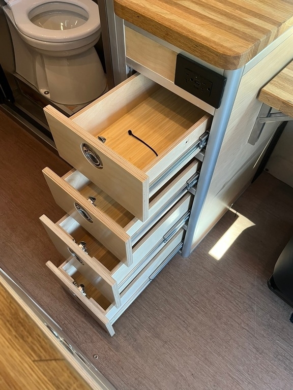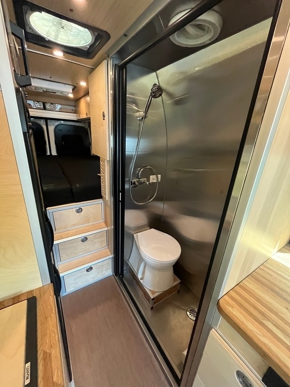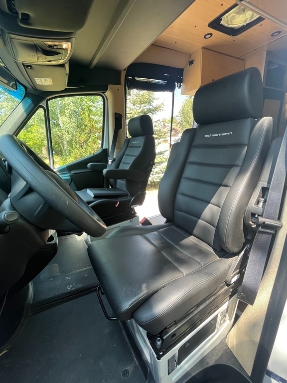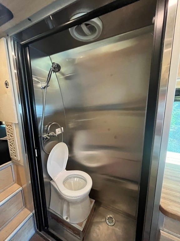 Victron 24v electrical system; 600Ah battery bank; Multiplus 2 24v 3000-watt inverter/charger; 400-watt PV solar array 24v; Accessory alternator for DC-DC charging; Advanced battery monitoring system - Cerbo GX and Lynx Smart BMS 500 with touchscreen display; Scheel Mann electronic heated driver and passenger seats with Scopema 360-degree swivels; CVC-VIP Captain’s seat black leather on swivel and sliding track, DOT-approved; Ruvati 16” drop-in kitchen sink, composite with custom countertop insert; Alpine Halo 11” touchscreen digital multimedia receiver; AquaHot 125D Hydronic heating system with 3 cab-mounted zone heaters and touchscreen display; Mabru RVSC 12000 BTU 12v air conditioning unit; Frigo Designs stainless steel shower with retractable door, 40” x 21” x 75”; TMC Marine quiet-flush electric toilet; NorCold 7 Cubic foot 12v fridge/freezer; Webasto Air Top 2000 STC diesel heater, under passenger seat mounted with smartcontroller; Uponor PEX-A plumbing system; 38-gallon fresh; 20-gallon black tank; 21-gallon gray tank; Raritan 12v macerator pumps with electric solenoid valves for gray and black tank dumps; Dual Maxxfan Deluxe remote control ventilation fans; 600lb heavy-duty locking drawer system for bulk storage underneath bed; LonSeal Spanish Chestnut flooring; 6” Custom 2-piece King size mattress; 2 Burner induction cooktop (Not integrated).
