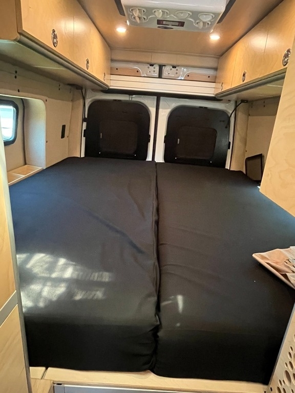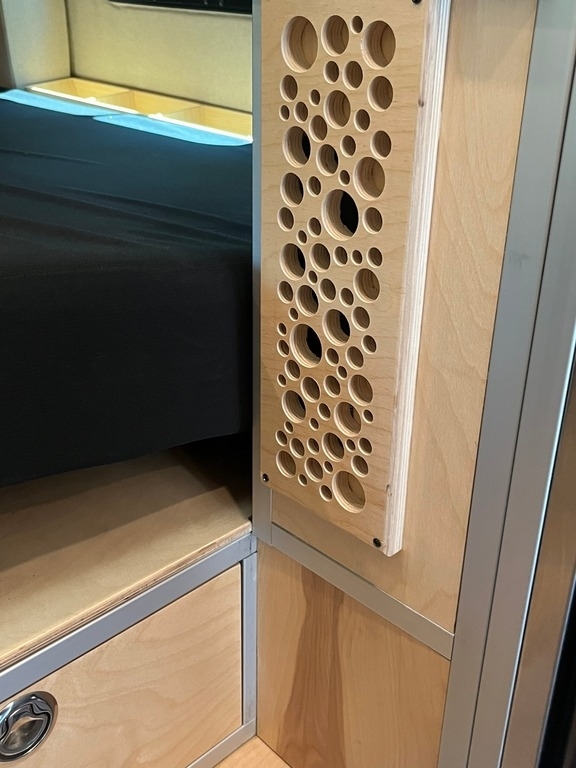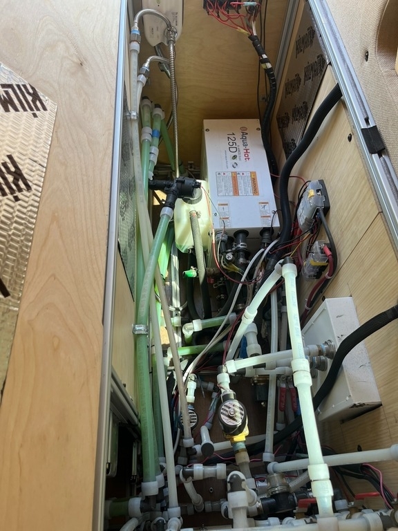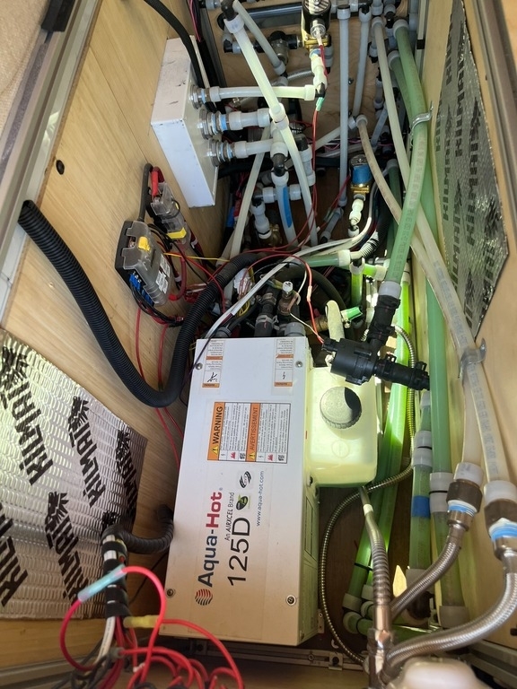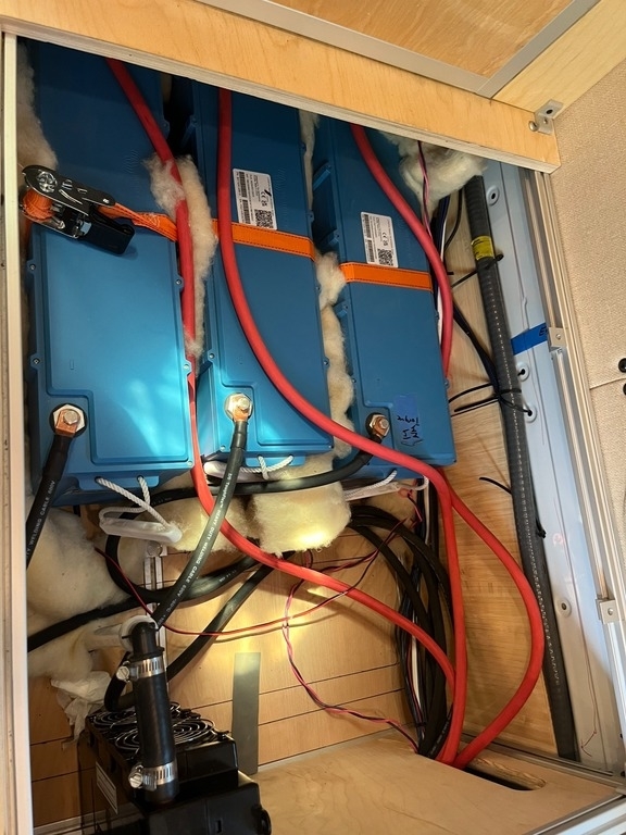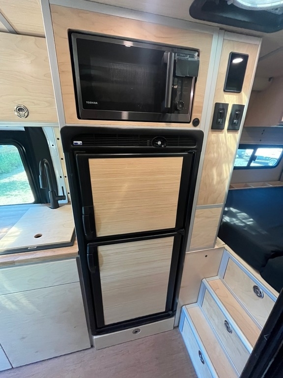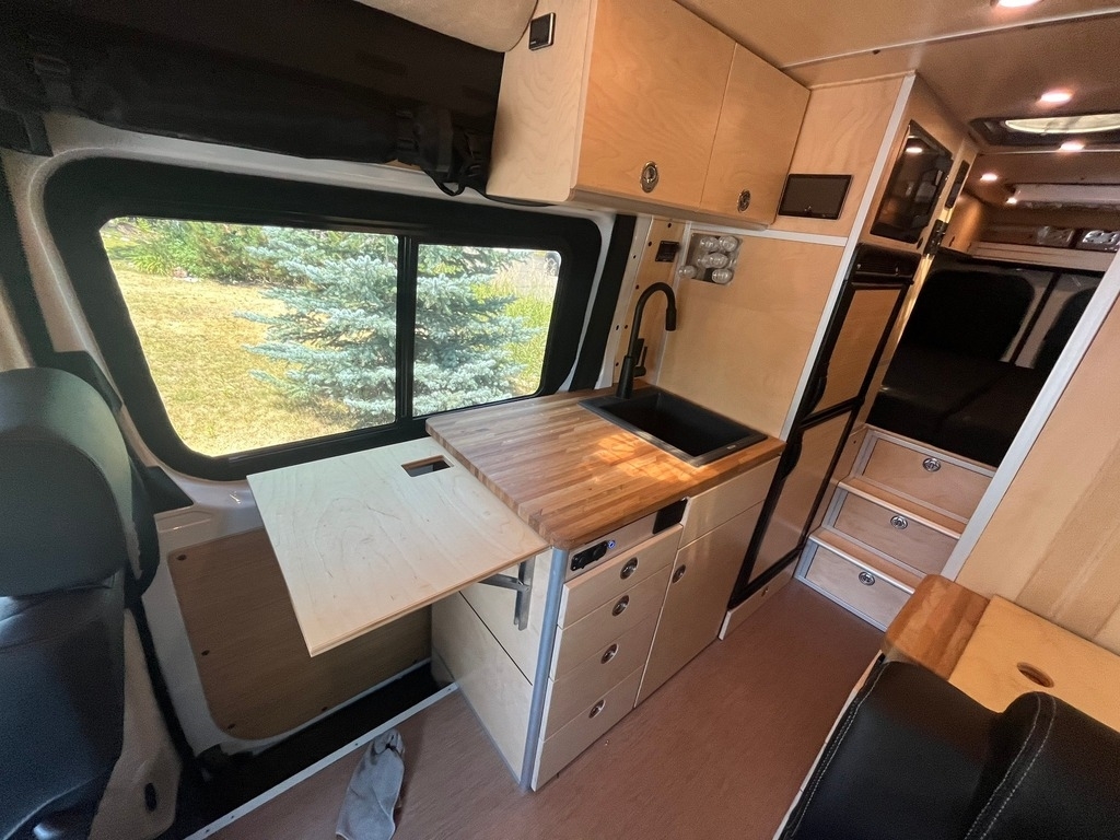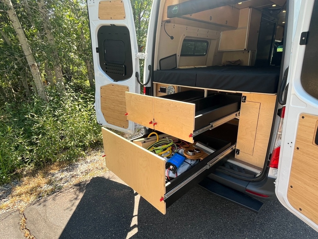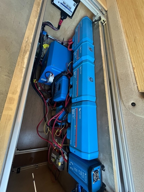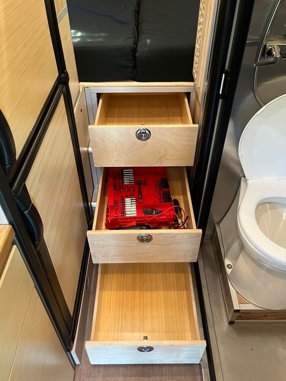 Victron 24v electrical system; 600Ah battery bank; Multiplus 2 24v 3000-watt inverter/charger; 400-watt PV solar array 24v; Accessory alternator for DC-DC charging; Advanced battery monitoring system - Cerbo GX and Lynx Smart BMS 500 with touchscreen display; Scheel Mann electronic heated driver and passenger seats with Scopema 360-degree swivels; CVC-VIP Captain’s seat black leather on swivel and sliding track, DOT-approved; Ruvati 16” drop-in kitchen sink, composite with custom countertop insert; Alpine Halo 11” touchscreen digital multimedia receiver; AquaHot 125D Hydronic heating system with 3 cab-mounted zone heaters and touchscreen display; Mabru RVSC 12000 BTU 12v air conditioning unit; Frigo Designs stainless steel shower with retractable door, 40” x 21” x 75”; TMC Marine quiet-flush electric toilet; NorCold 7 Cubic foot 12v fridge/freezer; Webasto Air Top 2000 STC diesel heater, under passenger seat mounted with smartcontroller; Uponor PEX-A plumbing system; 38-gallon fresh; 20-gallon black tank; 21-gallon gray tank; Raritan 12v macerator pumps with electric solenoid valves for gray and black tank dumps; Dual Maxxfan Deluxe remote control ventilation fans; 600lb heavy-duty locking drawer system for bulk storage underneath bed; LonSeal Spanish Chestnut flooring; 6” Custom 2-piece King size mattress; 2 Burner induction cooktop (Not integrated).